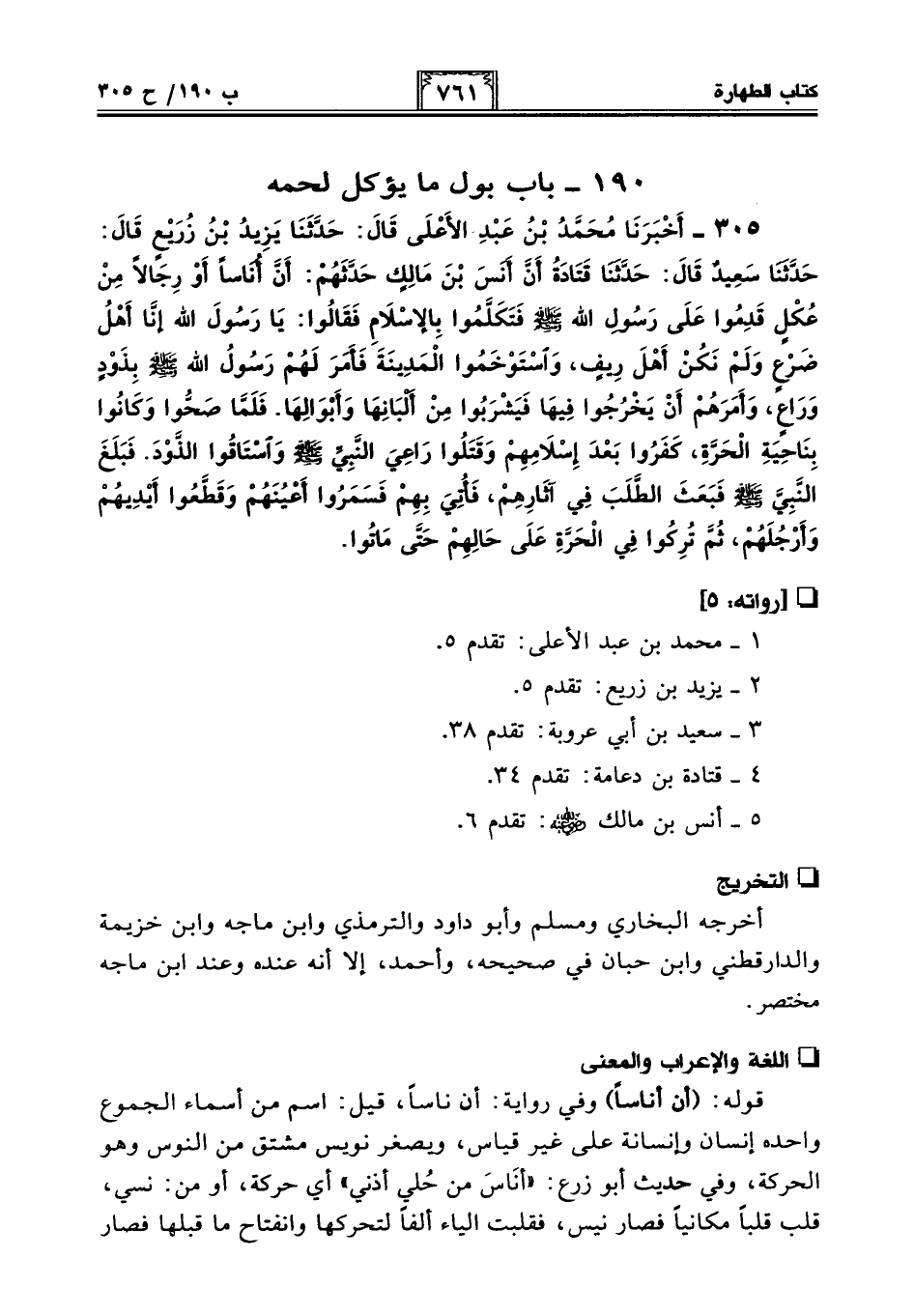 305 - أَخْبَرَنَا مُحَمَّدُ بْنُ عَبْدِ الأَعْلَى قَالَ: حَدَّثَنَا يَزِيدُ بْنُ زُرَيْعٍ قَالَ: حَدَّثَنَا سَعِيدٌ قَالَ: حَدَّثَنَا قَتَادَةُ أَنَّ أَنَسَ بْنَ مَالِكٍ حَدَّثَهُمْ: أَنَّ أُنَاسًا أَوْ رِجَالًا مِنْ عُكْلٍ قَدِمُوا عَلَى رَسُولِ اللَّهِ - صلى الله عليه وسلم - فَتَكَلَّمُوا بِالإِسْلَامِ فَقَالُوا: يَا رَسُولَ اللَّهِ إِنَّا أَهْلُ ضَرْعٍ وَلَمْ نَكُنْ أَهْلَ رِيفٍ، وَاسْتَوْخَمُوا الْمَدِينَةَ فَأَمَرَ لَهُمْ رَسُولُ اللَّهِ - صلى الله عليه وسلم - بِذَوْدٍ وَرَاعٍ، وَأَمَرَهُمْ أَنْ يَخْرُجُوا فِيهَا فَيَشْرَبُوا مِنْ أَلْبَانِهَا وَأَبْوَالِهَا. فَلَمَّا صَحُّوا وَكَانُوا بِنَاحِيَةِ الْحَرَّةِ، كَفَرُوا بَعْدَ إِسْلَامِهِمْ وَقَتَلُوا رَاعِيَ النَّبِيِّ - صلى الله عليه وسلم - وَاسْتَاقُوا الذَّوْدَ. فَبَلَغَ النَّبِيَّ - صلى الله عليه وسلم - فَبَعَثَ الطَّلَبَ فِي آثَارِهْمِ، فَأُتِيَ بِهِمْ فَسَمَرُوا أَعْيُنَهُمْ وَقَطَّعُوا أَيْدِيَهُمْ وَأَرْجُلَهُمْ، ثُمَّ تُرِكُوا فِي الْحَرَّةِ عَلَى حَالِهِمْ حَتَّى مَاتُوا.