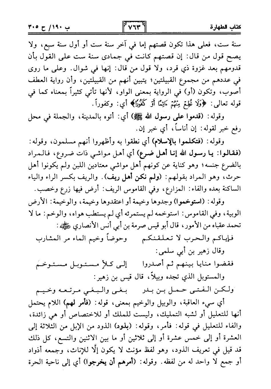 سنة ست، فعلى هذا تكون قصتهم إما في آخر سنة ست أو أول سنة سبع، ولا يصح قول من قال: إن قصتهم كانت في جمادى سنة ست على القول بأن قدومهم بعد غزوة ذي قرد، ولا قول من قال: إنها في شوال. وعلى ما روى في عددهم من مجموع القبيلتين؛ يتبين أنهم من القبيلتين، وأن رواية العطف أصوب، وتكون (أو) في الرواية بمعنى الواو، لأنها تأتي كثيرًا بمعناه كما في قوله تعالى: {وَلَا تُطِعْ مِنْهُمْ آثِمًا أَوْ كَفُورًا} أي: وكفورًا.