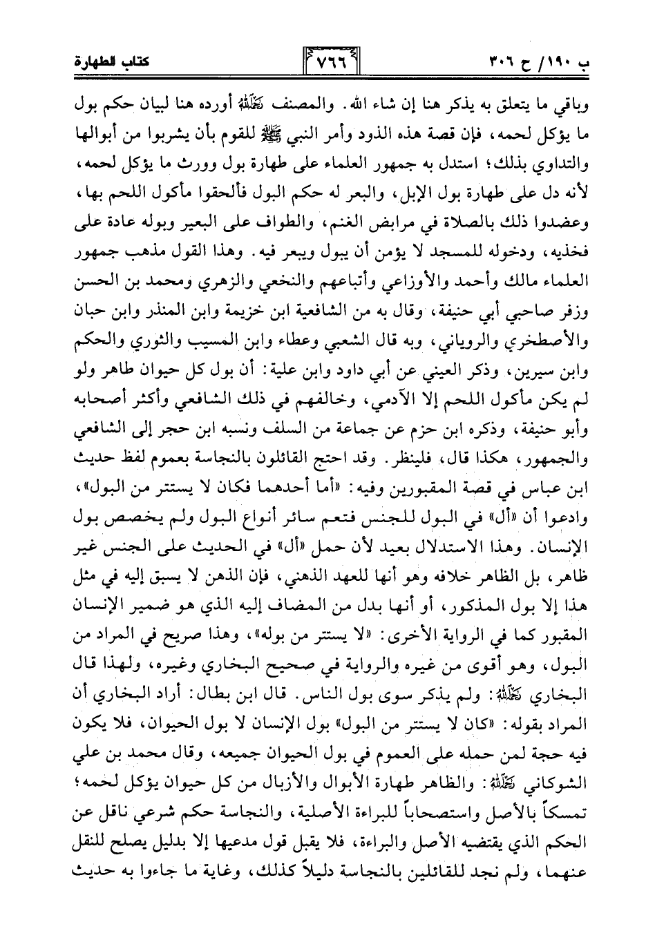 وباقي ما يتعلق به يذكر هنا إن شاء الله. والمصنف -رحمه الله- أورده هنا لبيان حكم بول ما يؤكل لحمه، فإن قصة هذه الذود وأمر النبي - صلى الله عليه وسلم - للقوم بأن يشربوا من أبوالها والتداوي بذلك؛ استدل به جمهور العلماء على طهارة بول وورث ما يؤكل لحمه، لأنه دل على طهارة بول الإبل، والبعر له حكم البول فألحقوا مأكول اللحم بها، وعضدوا ذلك بالصلاة في مرابض الغنم، والطواف على البعير وبوله عادة على فخذيه، ودخوله للمسجد لا يؤمن أن يبول ويبعر فيه. وهذا القول مذهب جمهور العلماء مالك وأحمد والأوزاعي وأتباعهم والنخعي والزهري ومحمد بن الحسن وزفر صاحبي أبي حنيفة، وقال به من الشافعية ابن خزيمة وابن المنذر وابن حبان والأصطخري والروياني، وبه قال الشعبي وعطاء وابن المسيب والثوري والحكم وابن سيرين، وذكر العيني عن أبي داود وابن علية: أن بول كل حيوان طاهر ولو لم يكن مأكول اللحم إلا الآدمي، وخالفهم في ذلك الشافعي وأكثر أصحابه وأبو حنيفة، وذكره ابن حزم عن جماعة من السلف ونسبه ابن حجر إلى الشافعي والجمهور، هكذا قال، فلينظر. وقد احتج القائلون بالنجاسة بعموم لفظ حديث ابن عباس في قصة المقبورين وفيه: "أما أحدهما فكان لا يستتر من البول"، وادعوا أن "أل" في البول للجنس فتعم سائر أنواع البول ولم يخصص بول الإنسان. وهذا الإستدلال بعيد لأن حمل "أل" في الحديث على الجنس غير ظاهر، بل الظاهر خلافه وهو أنها للعهد الذهني، فإن الذهن لا يسبق إليه في مثل هذا إلا بول المذكور، أو أنها بدل من المضاف إليه الذي هو ضمير الإنسان المقبور كما في الرواية الأخرى: "لا يستتر من بوله"، وهذا صريح في المراد من البول، وهو أقوى من غيره والرواية في صحيح البخاري وغيره، ولهذا قال البخاري -رحمه الله-: ولم يذكر سوى بول الناس. قال ابن بطال: أراد البخاري أن المراد بقوله: "كان لا يستتر من البول" بول الإنسان لا بول الحيوان، فلا يكون فيه حجة لمن حمله على العموم في بول الحيوان جميعه، وقال محمَّد بن علي الشوكاني -رحمه الله-: والظاهر طهارة الأبوال والأزبال من كل حيوان يؤكل لحمه؛ تمسكًا بالأصل واستصحابًا للبراءة الأصلية، والنجاسة حكم شرعي ناقل عن الحكم الذي يقتضيه الأصل والبراءة، فلا يقبل قول مدعيها إلا بدليل يصلح للنقل عنهما، ولم نجد للقائلين بالنجاسة دليلًا كذلك، وغاية ما جاءوا به حديث