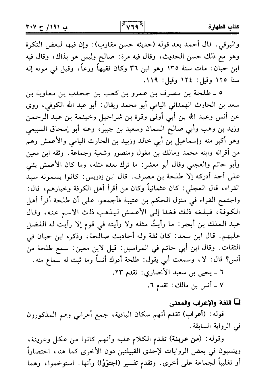 5 - طلحة بن مصرف بن عمرو بن كعب بن جحدب بن معاوية بن سعد بن الحارث الهمداني اليامي أبو محمَّد ويقال: أبو عبد الله الكوفي، روى عن أنس وعبد الله بن أبي أوفى وقرة بن شراحيل وخيثمة بن عبد الرحمن وزيد بن وهب وأبي صالح السمان وسعيد بن جبير، وعنه أبو إسحاق السبيعي وهو أكبر منه وإسماعيل بن أبي خالد وزبيد بن الحارث اليامي والأعمش وهم من أقرانه وابنه محمَّد ومالك بن مغول ومنصور وشعبة وجماعة. وثقه ابن معين وأبو حاتم والعجلي وقال أبو معشر: ما ترك بعده مثله، وما كان الأعمش يثني على أحد أدركه إلا طلحة بن مصرف. قال ابن إدريس: كانوا يسمونه سيد القراء، قال العجلي: كان عثمانيًا وكان من أقرأ أهل الكوفة وخيارهم، قال: واجتمع القراء في منزل الحكم بن عتيبة فأجمعوا على أن طلحة أقرأ أهل الكوفة، فبلغه ذلك فغدا إلى الأعمش ليذهب ذلك الإسم عنه، وقال عبد الملك بن أبجر: ما رأيتُ مثله ولا رأيته في قوم إلا رأيت له الفضل عليهم. قال ابن سعد: كان ثقة وله أحاديث صالحة، وذكره ابن حبان في الثقات. وقال ابن أبي حاتم في المراسيل: قيل لابن معين: سمع طلحة من أنس؟ قال: لا، وسمعت أبي يقول: طلحة أدرك أنسًا وما ثبت له سماع منه.