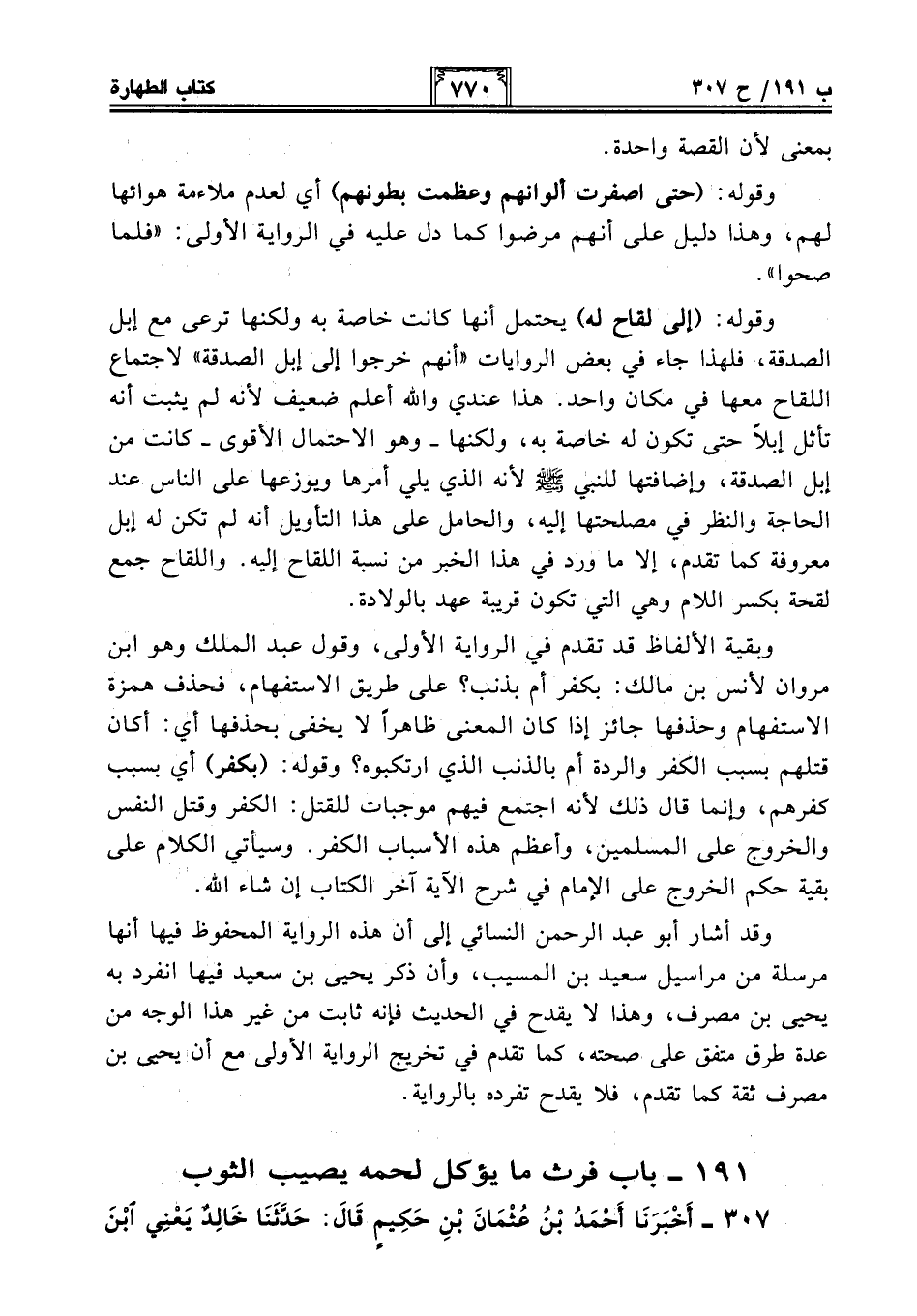 وبقية الألفاظ قد تقدم في الرواية الأولى، وقول عبد الملك وهو ابن مروان لأنس بن مالك: بكفر أم بذنب؟ على طريق الإستفهام، فحذف همزة الإستفهام وحذفها جائز إذا كان المعنى ظاهرًا لا يخفى بحذفها أي: أكان قتلهم بسبب الكفر والردة أم بالذنب الذي ارتكبوه؟ وقوله: (بكفر) أي بسبب كفرهم، وإنما قال ذلك لأنه اجتمع فيهم موجبات للقتل: الكفر وقتل النفس والخروج على المسلمين، وأعظم هذه الأسباب الكفر. وسيأتي الكلام على بقية حكم الخروج على الإِمام في شرح الآية آخر الكتاب إن شاء الله.