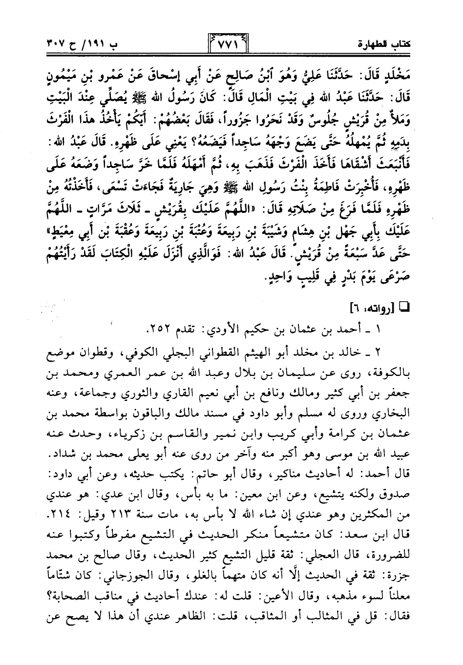 2 - خالد بن مخلد أبو الهيثم القطواني البجلي الكوفي، وقطوان موضع بالكوفة، روى عن سليمان بن بلال وعبد الله بن عمر العمري ومحمد بن جعفر بن أبي كثير ومالك ونافع بن أبي نعيم القاري والثوري وجماعة، وعنه البخاري وروى له مسلم وأبو داود في مسند مالك والباقون بواسطة محمَّد بن عثمان بن كرامة وأبي كريب وابن نمير والقاسم بن زكرياء، وحدث عنه عبيد الله بن موسى وهو أكبر منه وآخر من روى عنه أبو يعلى محمَّد بن شداد. قال أحمد: له أحاديث مناكير، وقال أبو حاتم: يكتب حديثه، وعن أبي داود: صدوق ولكنه يتشيع، وعن ابن معين: ما به بأس، وقال ابن عدي: هو عندي من المكثرين وهو عندي إن شاء الله لا بأس به، مات سنة 213 وقيل: 214. قال ابن سعد: كان متشيعًا منكر الحديث في التشيع مفرطًا وكتبوا عنه للضرورة، قال العجلي: ثقة قليل التشيع كثير الحديث، وقال صالح بن محمَّد جزرة: ثقة في الحديث إلا أنه كان متهمًا بالغلو، وقال الجوزجاني: كان شتّامًا معلنًا لسوء مذهبه، وقال الأعين: قلت له: عندك أحاديث في مناقب الصحابة؟ فقال: قل في المثالب أو المثاقب، قلت: الظاهر عندي أن هذا لا يصح عن