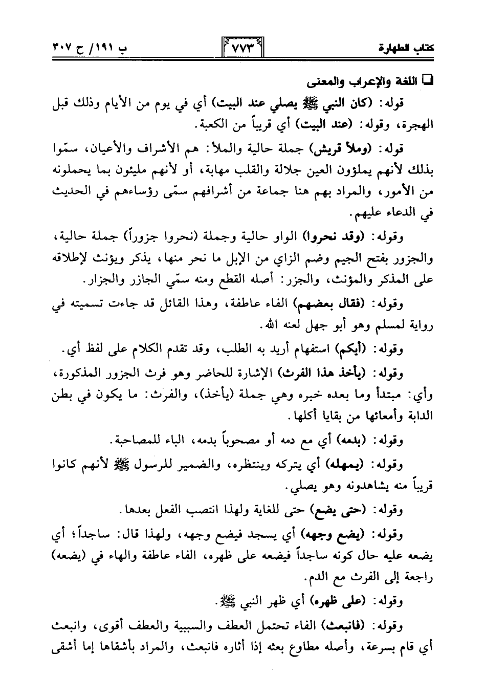 وقوله: (يأخذ هذا الفرث) الإشارة للحاضر وهو فرث الجزور المذكورة، وأي: مبتدأ وما بعده خبره وهي جملة (يأخذ)، والفرث: ما يكون في بطن الدابة وأمعائها من بقايا أكلها.
