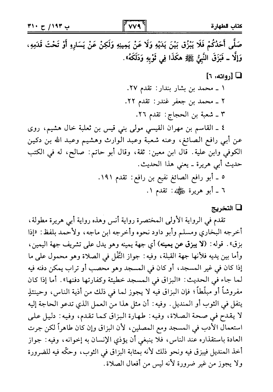 تقدم في الرواية الأولى المختصرة رواية أنس وهذه رواية أبي هريرة مطولة، أخرجه البخاري ومسلم وأبو داود نحوه وأخرجه ابن ماجه، ولأحمد بلفظ: "إذا بزق". قوله: (لا يبزق عن يمينه) أي جهة يمينه وهو يدل على تشريف جهة اليمين، وأما بين يديه فلأنها جهة القبلة، وفيه: جواز التَّفْل في الصلاة وهو محمول على ما إذا كان في غير المسجد، أو كان في المسجد وهو محصب أو تراب يمكن دفنه فيه لما جاء في الحديث: "البزاق في المسجد خطيئة وكفارتها دفنها". أما إذا كان مفروشًا أو مبلّطًا؛ فإن البزاق فيه لا يجوز لما في ذلك من أذية الناس، وحينئذٍ يتفل في الثوب أو المنديل. وفيه: أن مثل هذا من العمل الذي تدعو الحاجة إليه لا يقدح في صحة الصلاة، وفيه: طهارة البزاق كما تقدم، وفيه: دليل على استعمال الأدب في المسجد ومع المصلين, لأن البزاق وإن كان طاهرًا لكن جرت العادة باستقذاره عند الناس، فلا ينبغي أن يؤذي الإنسان به إخوانه، وفيه: جواز أخذ المنديل فيبزق فيه ونحو ذلك لأنه بمثابة البزاق في الثوب، وحكه فيه للضرورة ولا يجوز من غير ضرورة لأنه ليس من أفعال الصلاة.