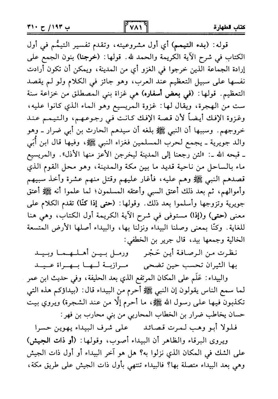 قوله: (بدء التيمم) أي أول مشروعيته، وتقدم تفسير التيمم في أول الكتاب في شرح الآية الكريمة والحمد لله. قولها: (خرجنا) بنون الجمع على إرادة الجماعة الذين خرجوا في الغزو أي من المدينة، ويمكن أن تكون أرادت نفسها على سبيل التعظيم عند العرب، وهو جائز في الكلام ولو لم يقصد التعظيم. قولها: (في بعض أسفاره) هي غزاة بني المصطلق من خزاعة سنة ست من الهجرة، ويقال لها: غزوة المريسيع وهو الماء الذي كانوا عليه، وغزوة الإفك أيضًا لأن قصة الإفك كانت في رجوعهم، والتيمم عند خروجهم. وسببها أن النبي - صلى الله عليه وسلم - بلغه أن سيدهم الحارث بن أبي ضرار -وهو والد جويرية- يجمع لحرب المسلمين فغزاه النبي - صلى الله عليه وسلم -، وفيها قال ابن أُبَي -قبحه الله-: "لئن رجعنا إلى المدينة ليخرجن الأعز منها الأذل". والمريسيع ماء بالساحل من ناحية قديد ما بين مكة والمدينة، وهو محل القوم الذي قصدهم النبي - صلى الله عليه وسلم - وهم عليه، فأغار عليهم وقتل منهم عشرة وأخذ سبيهم وأموالهم، ثم بعد ذلك أعتق السبي وأعتقه المسلمون؛ لما علموا أنه - صلى الله عليه وسلم - أعتق جويرية وتزوجها وأسلموا بعد ذلك. وقولها: (حتى إذا كنا) تقدم الكلام على معنى (حتى) و (إذا) مستوفى في شرح الآية الكريمة أول الكتاب، وهي هنا للغاية. وكنا بمعنى وصلنا البيداء ونزلنا بها، والبيداء أصلها الأرض المتسعة الخالية وجمعها بيد، قال جرير بن الخطفي: