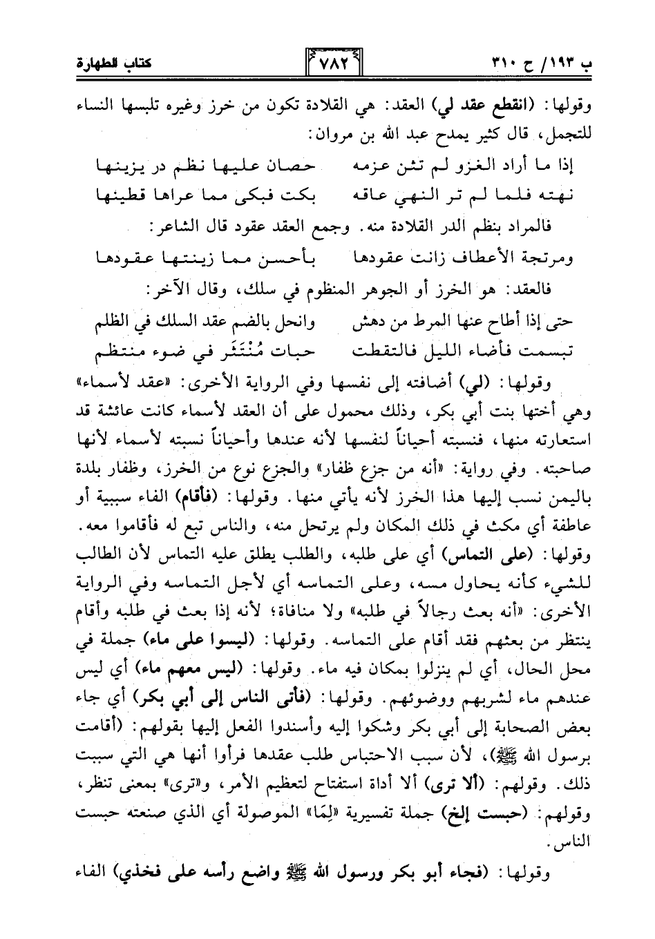 وقولها: (لي) أضافته إلى نفسها وفي الرواية الأخرى: "عقد لأسماء" وهي أختها بنت أبي بكر، وذلك محمول على أن العقد لأسماء كانت عائشة قد استعارته منها، فنسبته أحيانًا لنفسها لأنه عندها وأحيانًا نسبته لأسماء لأنها صاحبته. وفي رواية: "أنه من جزع ظفار" والجزع نوع من الخرز، وظفار بلدة باليمن نسب إليها هذا الخرز لأنه يأتي منها. وقولها: (فأقام) الفاء سببية أو عاطفة أي مكث في ذلك المكان ولم يرتحل منه، والناس تبع له فأقاموا معه. وقولها: (على التماس) أي على طلبه، والطلب يطلق عليه التماس لأن الطالب للشيء كأنه يحاول مسه، وعلى التماسه أي لأجل التماسه وفي الرواية الأخرى: "أنه بعث رجالًا في طلبه" ولا منافاة؛ لأنه إذا بعث في طلبه وأقام ينتظر من بعثهم فقد أقام على التماسه. وقولها: (ليسوا على ماء) جملة في محل الحال، أي لم ينزلوا بمكان فيه ماء. وقولها: (ليس معهم ماء) أي ليس عندهم ماء لشربهم ووضوئهم. وقولها: (فأتى الناس إلى أبي بكر) أي جاء بعض الصحابة إلى أبي بكر وشكوا إليه وأسندوا الفعل إليها بقولهم: (أقامت برسول الله - صلى الله عليه وسلم -)، لأن سبب الإحتباس طلب عقدها فرأوا أنها هي التي سببت ذلك. وقولهم: (ألا ترى) ألا أداة استفتاح لتعظيم الأمر، و"ترى" بمعنى تنظر، وقولهم: (حبست إلخ) جملة تفسيرية "لِمَا" الموصولة أي الذي صنعته حبست الناس.