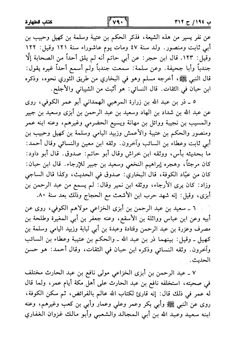 5 - ذر بن عبد الله بن زرارة المرهبي الهمداني أبو عمر الكوفي، روى عن عبد الله بن شداد بن الهاد وسعيد بن عبد الرحمن بن أبزى وسعيد بن جبير والمسيب بن نجيبة ووائل بن مهانة ويسيع الحضرمي وغيرهم، وعنه ابنه عمر ومنصور والحكم بن عتيبة والأعمش وزبيد اليامي وسلمة بن كهيل وحبيب بن أبي ثابت وعطاء بن السائب وآخرون. وثقه ابن معين والنسائي وقال أحمد: ما بحديثه بأس، ووثقه ابن خراش وقال أبو حاتم: صدوق. قال أبو داود: كان مرجئًا، وهجره إبراهيم النخعي وسعيد بن جبير للإرجاء. قال ابن حبان: كان من عبّاد الكوفة، قال البخاري: صدوق في الحديث، وكذا قال الساجي وزاد: كان يرى الأرجاء، ووثقه ابن نمير وقال: لم يسمع من عبد الرحمن بن أبزى، وقيل: إنه شهد حرب ابن الأشعث مع الحجاج وذلك بعد سنة 80.