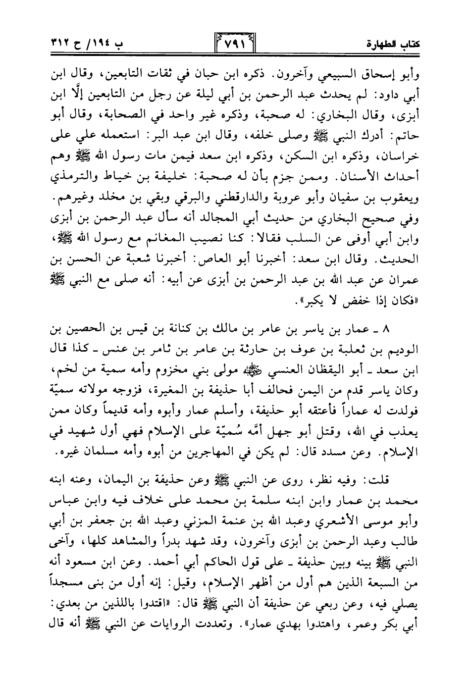 قلت: وفيه نظر، روى عن النبي - صلى الله عليه وسلم - وعن حذيفة بن اليمان، وعنه ابنه محمد بن عمار وابن ابنه سلمة بن محمد على خلاف فيه وابن عباس وأبو موسى الأشعري وعبد الله بن عنمة المزني وعبد الله بن جعفر بن أبي طالب وعبد الرحمن بن أبزى وآخرون، وقد شهد بدرًا والمشاهد كلها، وآخى النبي - صلى الله عليه وسلم - بينه وبين حذيفة -على قول الحاكم أبي أحمد. وعن ابن مسعود أنه من السبعة الذين هم أول من أظهر الإِسلام، وقيل: إنه أول من بنى مسجدًا يصلي فيه، وعن ربعي عن حذيفة أن النبي - صلى الله عليه وسلم - قال: "اقتدوا باللذين من بعدي: أبي بكر وعمر، واهتدوا بهدي عمار". وتعددت الروايات عن النبي - صلى الله عليه وسلم - أنه قال