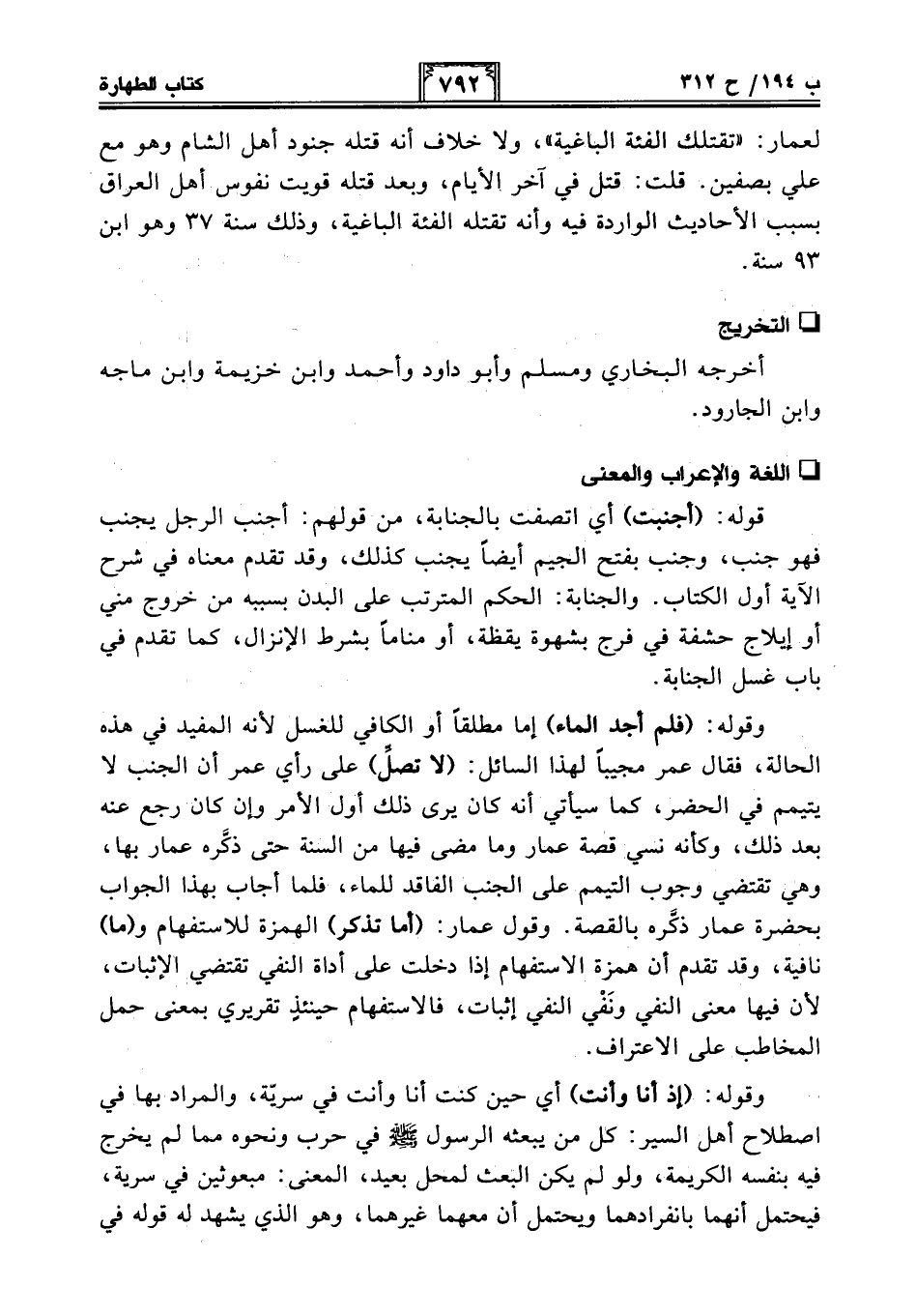 وقوله: (فلم أجد الماء) إما مطلقًا أو الكافي للغسل لأنه المفيد في هذه الحالة، فقال عمر مجيبًا لهذا السائل: (لا تصل) على رأي عمر أن الجنب لا يتيمم في الحضر، كما سيأتي أنه كان يرى ذلك أول الأمر وإن كان رجع عنه بعد ذلك، وكأنه نسي قصة عمار وما مضى فيها من السنة حتى ذكَّره عمار بها، وهي تقتضي وجوب التيمم على الجنب الفاقد للماء، فلما أجاب بهذا الجواب بحضرة عمار ذكَّره بالقصة. وقول عمار: (أما تذكر) الهمزة للإستفهام و (ما) نافية، وقد تقدم أن همزة الإستفهام إذا دخلت على أداة النفي تقتضي الإثبات، لأن فيها معنى النفي ونَفْي النفي إثبات، فالإستفهام حينئذٍ تقريري بمعنى حمل المخاطب على الإعتراف.