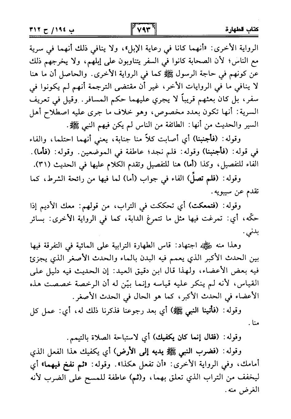 وقوله: (فضرب النبي - صلى الله عليه وسلم - يديه إلى الأرض) أي يكفيك هذا الفعل الذي أمامك، وفي الرواية الأخرى: "أن تفعل هكذا". وقوله: "ثم نفخ فيهما" أي ليخفف من التراب الذي تعلق بهما، و (ثم) عاطفة للمسح على الضرب لأنه الغرض منه.