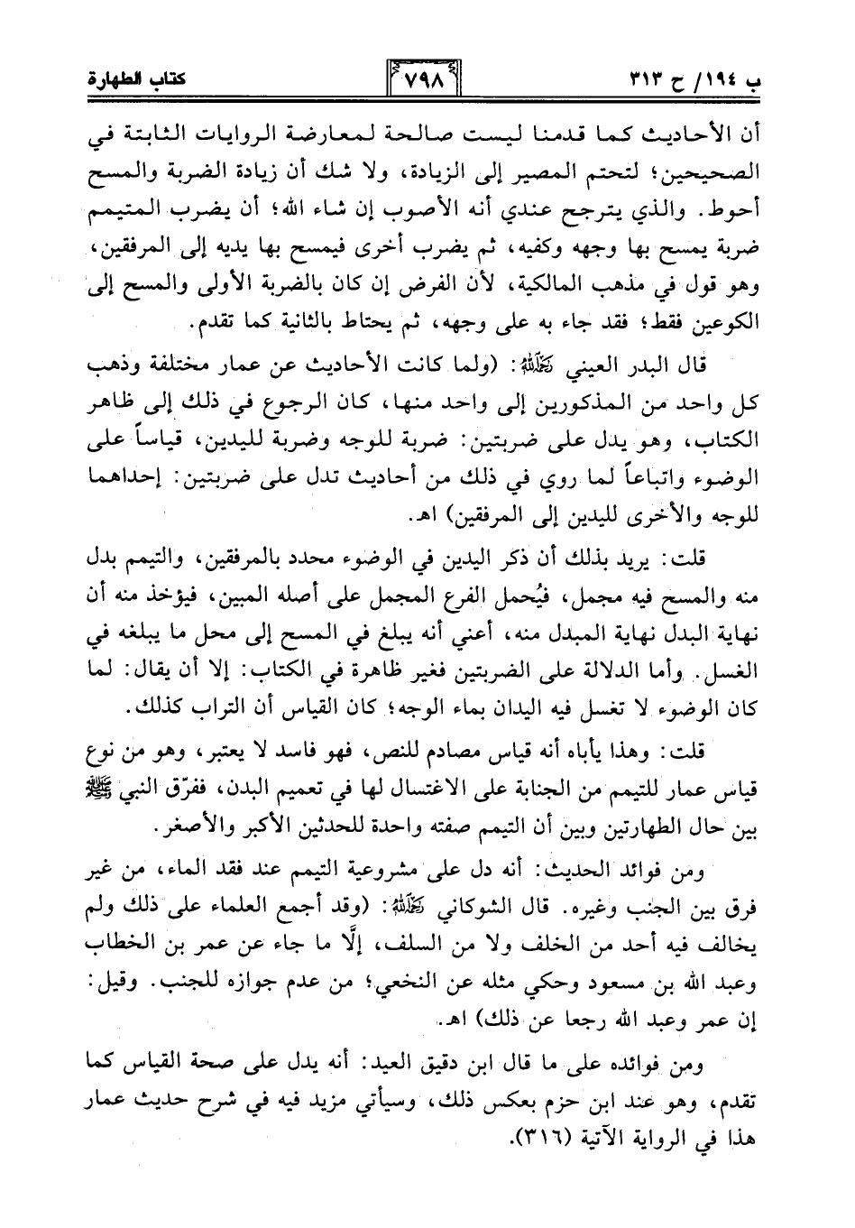 قال البدر العيني -رحمه الله-: (ولما كانت الأحاديث عن عمار مختلفة وذهب كل واحد من المذكورين إلى واحد منها، كان الرجوع في ذلك إلى ظاهر الكتاب، وهو يدل على ضربتين: ضربة للوجه وضربة لليدين، قياسًا على الوضوء واتباعًا لما روي في ذلك من أحاديث تدل على ضربتين: إحداهما للوجه والأخرى لليدين إلى المرفقين) اهـ.
