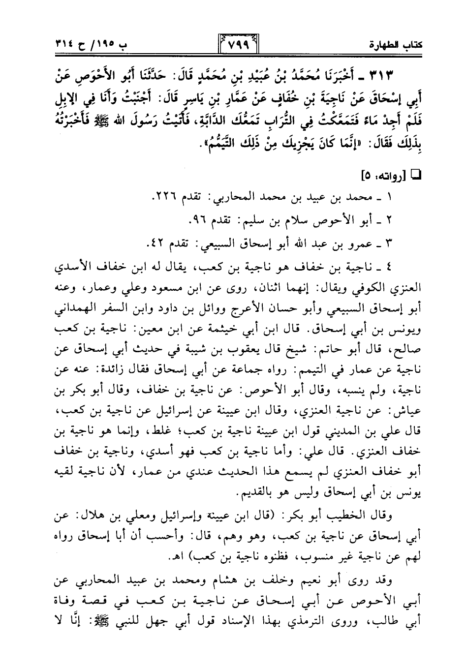 4 - ناجية بن خفاف هو ناجية بن كعب، يقال له ابن خفاف الأسدي العنزي الكوفي ويقال: إنهما اثنان، روى عن ابن مسعود وعلي وعمار، وعنه أبو إسحاق السبيعي وأبو حسان الأعرج ووائل بن داود وابن السفر الهمداني ويونس بن أبي إسحاق. قال ابن أبي خيثمة عن ابن معين: ناجية بن كعب صالح، قال أبو حاتم: شيخ قال يعقوب بن شيبة في حديث أبي إسحاق عن ناجية عن عمار في التيمم: رواه جماعة عن أبي إسحاق فقال زائدة: عنه عن ناجية، ولم ينسبه، وقال أبو الأحوص: عن ناجية بن خفاف، وقال أبو بكر بن عياش: عن ناجية العنزي، وقال ابن عيينة عن إسرائيل عن ناجية بن كعب، قال علي بن المديني قول ابن عيينة ناجية بن كعب؛ غلط، وإنما هو ناجية بن خفاف العنزي. قال علي: وأما ناجية بن كعب فهو أسدي، وناجية بن خفاف أبو خفاف العنزي لم يسمع هذا الحديث عندي من عمار, لأن ناجية لقيه يونس بن أبي إسحاق وليس هو بالقديم.