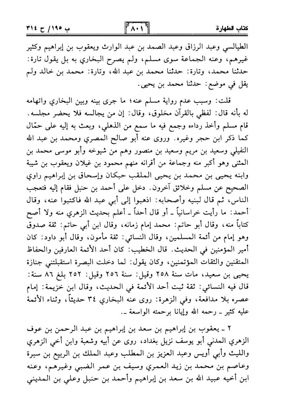 قلت: وسبب عدم رواية مسلم عنه؛ ما جرى بينه وبين البخاري واتهامه له بأنه قال: لفظي بالقرآن مخلوق، وقال: إن من يجالسه فلا يحضر مجلسه. قام مسلم وأخذ رداءه وجمع فيه ما سمع من الذهلي، وبعث به إليه على حمّال كما ذكر ابن حجر وغيره. وروى عنه أبو صالح المصري ومحمد بن عبد الله النفيلي وسعيد بن مريم وسعيد بن منصور وهم من شيوخه وأبو موسى محمد بن المثنى وهو أكبر منه وجماعة من أقرانه منهم محمود بن غيلان ويعقوب بن شيبة وابنه يحيي بن محمد بن يحيي الملقب حبكان وإسحاق بن إبراهيم راوي الصحيح عن مسلم وخلائق آخرون. دخل على أحمد بن حنبل فقام إليه فتعجب الناس، ثم قال لبنيه وأصحابه: اذهبوا إلى أبي عبد الله فاكتبوا عنه، وقال أحمد: ما رأيت خراسانيًا -أو قال أحدًا- أعلم بحديث الزهري منه ولا أصح كتابًا منه، وقال أبو حاتم: محمد إمام زمانه، وقال ابن أبي حاتم: ثقة صدوق وهو إمام من أئمة المسلمين، وقال النسائي: ثقة مأمون، وقال أبو داود: كان أمير المؤمنين في الحديث. قال الخطيب: كان أحد الأئمة العارفين والحفاظ المتقنين والثقات المؤتمنين، وكان يقول: لما دخلت البصرة استقبلتني جنازة يحيي بن سعيد، مات سنة 258 وقيل: سنة 256 وقيل: 252 بلغ 86 سنة: قال فيه النسائي: ثقة ثبت أحد الأئمة في الحديث، وقال ابن خزيمة: إمام عصره بلا مدافعة، وفي الزهرة: روى عنه البخاري 34 حديثًا، وثناء الأئمة عليه كثير -رحمه الله وإيانا برحمته الواسعة-.