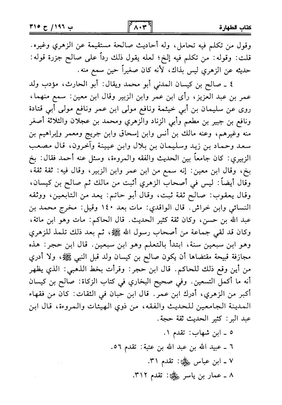 4 - صالح بن كيسان المدني أبو محمد ويقال: أبو الحارث، مؤدب ولد عمر بن عبد العزيز، رأى ابن عمر وابن الزبير وقال ابن معين: سمع منهما، روى عن سليمان بن أبي خيثمة ونافع مولى ابن عمر ونافع مولى أبي قتادة ونافع بن جبير بن مطعم وأبي الزناد والزهري ومحمد بن عجلان والثلاثة أصغر منه وغيرهم، وعنه مالك بن أنس وابن إسحاق وابن جريج ومعمر وإبراهيم بن سعد وحماد بن زيد وسليمان بن بلال وابن عيينة وآخرون، قال مصعب الزبيري: كان جامعًا بين الحديث والفقه والمروءة، وسئل عنه أحمد فقال: بخ بخ، وقال ابن معين: إنه سمع من ابن عمر وابن الزبير، وقال فيه: ثقة ثقة، وقال أيضًا: ليس في أصحاب الزهري أثبت من مالك ثم صالح بن كيسان، وقال يعقوب: صالح ثقة ثبت، وقال أبو حاتم: يعد من التابعين، ووثقه النسائي وابن خراش. قال الواقدي: مات بعد 140 وقيل: مخرج محمد بن عبد الله بن حسن، وكان ثقة كثير الحديث. قال الحاكم: مات وهو ابن مائة، وكان قد لقي جماعة من أصحاب رسول الله - صلى الله عليه وسلم -، ثم بعد ذلك تلمذ للزهري وهو ابن سبعين سنة، ابتدأ بالتعلم وهو ابن سبعين. قال ابن حجر: هذه مجازفة قبيحة مقتضاها أن يكون صالح بن كيسان ولد قبل النبي - صلى الله عليه وسلم -، ولا أدري من أين وقع ذلك للحاكم. قال ابن حجر: وقرأت بخط الذهبي: الذي يظهر أنه ما أكمل التسعين. وفي صحيح البخاري في كتاب الزكاة: صالح بن كيسان أكبر من الزهري، أدرك ابن عمر. قال ابن حبان في الثقات: كان من فقهاء المدينة الجامعين للحديث والفقه، من ذوي الهيئات والمروءة، قال ابن عبد البر: كثير الحديث ثقة حجة.