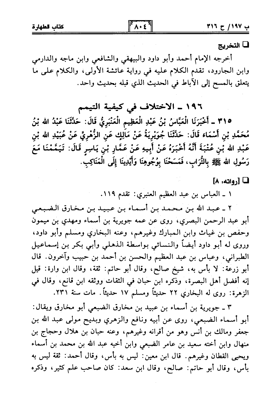 2 - عبد الله بن محمد بن أسماء بن عبيد بن مخارق الضبعي أبو عبد الرحمن البصري، روى عن عمه جويرية بن أسماء ومهدي بن ميمون وحفص بن غياث وابن المبارك وغيرهم، وعنه البخاري ومسلم وأبو داود، وروى له أبو داود أيضًا والنسائي بواسطة الذهلي وأبي بكر بن إسماعيل الطبراني، وعباس بن عبد العظيم والحسن بن أحمد بن حبيب وآخرون. قال أبو زرعة: لا بأس به، شيخ صالح، وقال أبو حاتم: ثقة، وقال ابن وارة: قيل إنه أفضل أهل البصرة، وذكره ابن حبان في الثقات ووثقه ابن قانع، وقال في الزهرة: روى له البخاري 22 حديثًا ومسلم 17 حديثًا. مات سنة 231.