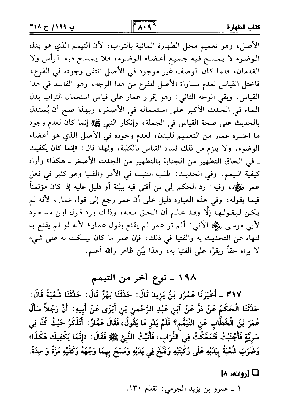 الأصل، وهو تعميم محل الطهارة المائية بالتراب؛ لأن التيمم الذي هو بدل الوضوء لا يمسح فيه جميع أعضاء الوضوء، فلا يمسح فيه الرأس ولا القدمان، فلما كان الوصف غير موجود في الأصل انتفى وجوده في الفرع، فاختل القياس لعدم مساواة الأصل للفرع من هذا الوجه، وهو الفاسد في هذا القياس. وبقي الوجه الثاني: وهو إقرار عمار على قياس استعمال التراب بدل الماء في الحدث الأكبر على استعماله في الأصغر، وبهذا صح أن يُستدل بالحديث على صحة القياس في الجملة، وإنكار النبي - صلى الله عليه وسلم - إنما كان لعدم وجود ما اعتبره عمار من التعميم للبدن، لعدم وجوده في الأصل الذي هو أعضاء الوضوء، ولا يلزم من ذلك فساد القياس بالكلية، ولهذا قال: "إنما كان يكفيك -في إلحاق التطهير من الجنابة بالتطهير من الحدث الأصغر- هكذا" وأراه كيفية التيمم. وفي الحديث: طلب التثبت في الأمر والفتيا وهو كثير في فعل عمر - رضي الله عنه - وفيه: رد الحكم إلى من أفتى فيه ببينة أو دليل عليه إذا كان مؤتمنًا فيما يقوله، وفي هذه العبارة دليل على أن عمر رجع إلى قول عمار, لأنه لم يكن ليقولها إلا وقد علم أن الحق معه، وذلك يرد قول ابن مسعود لأبي موسى -رضي الله عنهما- الآتي: ألم تر عمر لم يقنع بقول عمار؛ لأنه لو لم يقنع به لنهاه عن التحديث به والفتيا في ذلك، فإن عمر ما كان ليسكت له على شيء لا يراه حقًا ويقرّه على الفتيا به، وهذا بيِّن ظاهر والله أعلم.