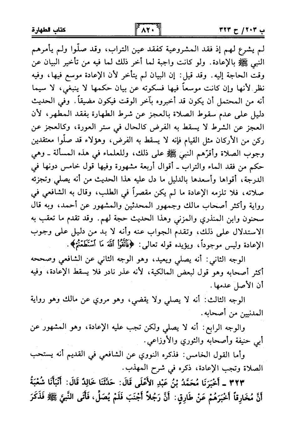 323 - أَخْبَرَنَا مُحَمَّدُ بْنُ عَبْدِ الأَعْلَى قَالَ: حَدَّثَنَا خَالِدٌ قَالَ: أَنْبَأَنَا شُعْبَةُ أَنَّ مُخَارِقًا أَخْبَرَهُمْ عَنْ طَارِقٍ: أَنَّ رَجُلًا أَجْنَبَ فَلَمْ يُصَلِّ، فَأَتَى النَّبِيَّ - صلى الله عليه وسلم - فَذَكَرَ