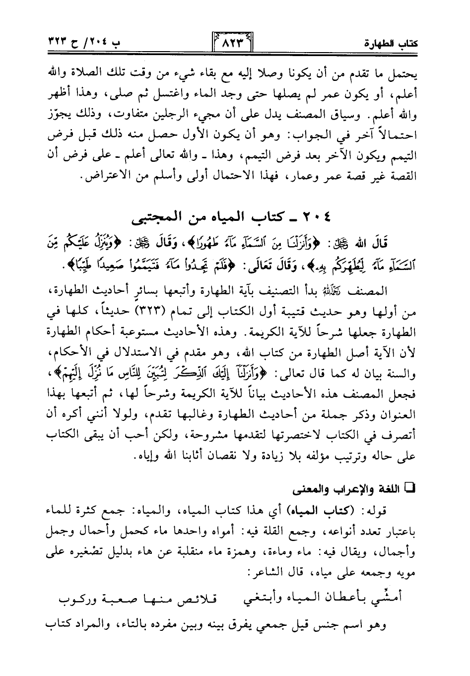 المصنف -رحمه الله- بدأ التصنيف بآية الطهارة وأتبعها بسائرٍ أحاديث الطهارة، من أولها وهو حديث قتيبة أول الكتاب إلى تمام (323) حديثًا، كلها في الطهارة جعلها شرحًا للآية الكريمة. وهذه الأحاديث مستوعبة أحكام الطهارة لأن الآية أصل الطهارة من كتاب الله، وهو مقدم في الإستدلال في الأحكام، والسنة بيان له كما قال تعالى: {وَأَنْزَلْنَا إِلَيْكَ الذِّكْرَ لِتُبَيِّنَ لِلنَّاسِ مَا نُزِّلَ إِلَيْهِمْ}، فجعل المصنف هذه الأحاديث بيانًا للآية الكريمة وشرحًا لها، ثم أتبعها بهذا العنوان وذكر جملة من أحاديث الطهارة وغالبها تقدم، ولولا أنني أكره أن أتصرف في الكتاب لاختصرتها لتقدمها مشروحة، ولكن أحب أن يبقى الكتاب على حاله وترتيب مؤلفه بلا زيادة ولا نقصان أثابنا الله وإياه.