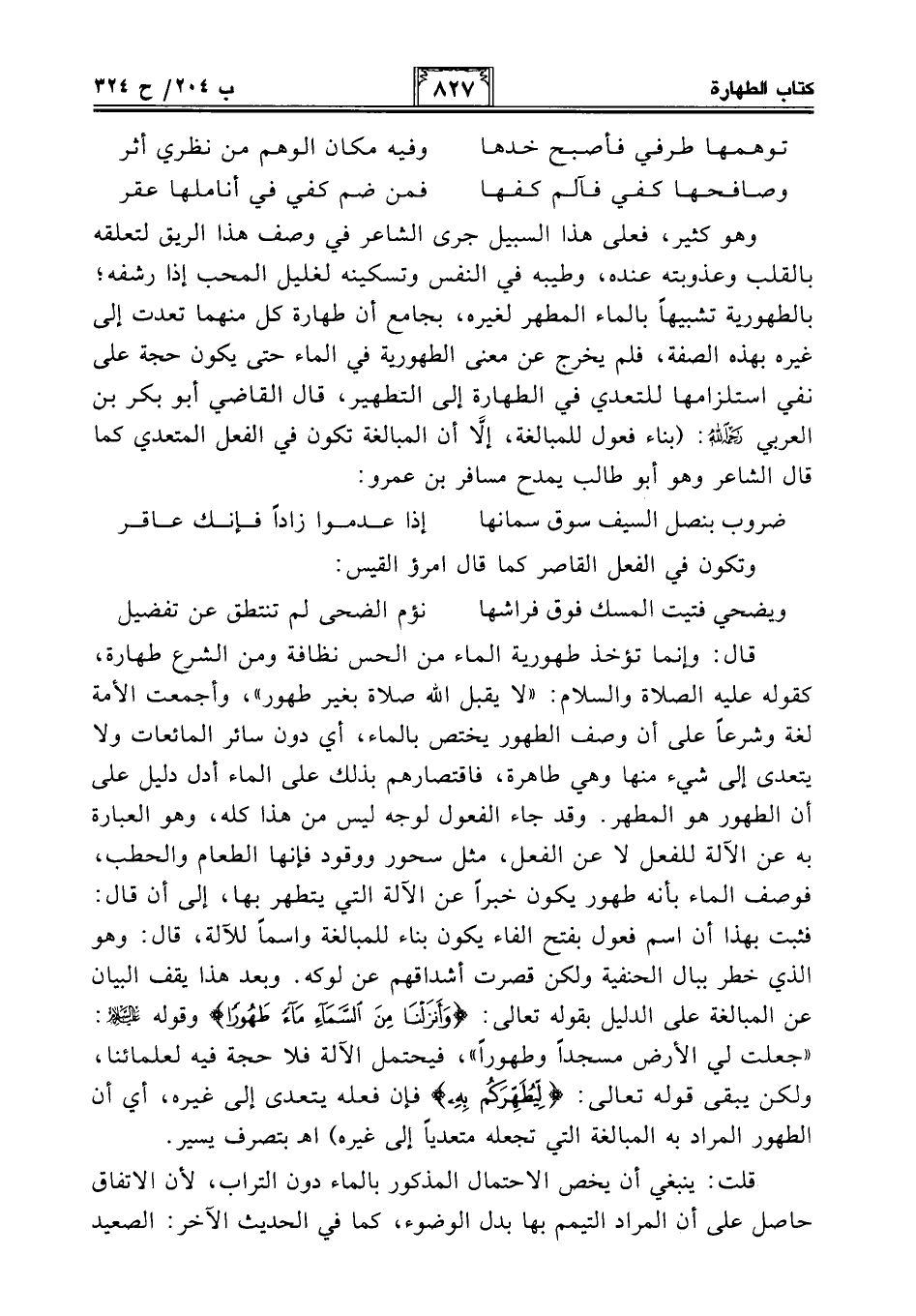 وهو كثير، فعلى هذا السبيل جرى الشاعر في وصف هذا الريق لتعلقه بالقلب وعذوبته عنده، وطيبه في النفس وتسكينه لغليل المحب إذا رشفه؛ بالطهورية تشبيهًا بالماء المطهر لغيره، بجامع أن طهارة كل منهما تعدت إلى غيره بهذه الصفة، فلم يخرج عن معنى الطهورية في الماء حتى يكون حجة على نفي استلزامها للتعدي في الطهارة إلى التطهير، قال القاضي أبو بكر بن العربي -رحمه الله-: (بناء فعول للمبالغة، إلَّا أن المبالغة تكون في الفعل المتعدي كما قال الشاعر وهو أبو طالب يمدح مسافر بن عمرو: