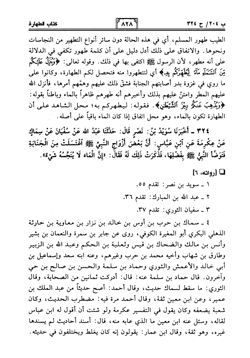 324 - أَخْبَرَنَا سُوَيْدُ بْنُ نَصْرٍ قَالَ: حَدَّثَنَا عَبْدُ اللَّهِ عَنْ سُفْيَانَ عَنْ سِمَاكٍ عَنْ عِكْرِمَةَ عَنِ ابْنِ عَبَّاسٍ: أَنَّ بَعْضَ أَزْوَاجِ النَّبِيِّ - صلى الله عليه وسلم - اغْتَسَلَتْ مِنَ الْجَنَابَةِ فَتَوَضَّأَ النَّبِيُّ - صلى الله عليه وسلم - بِفَضْلِهَا، فَذَكَرَتْ ذَلِكَ لَهُ فَقَالَ: "إِنَّ الْمَاءَ لَا يُنَجِّسُهُ شَيْءٌ".