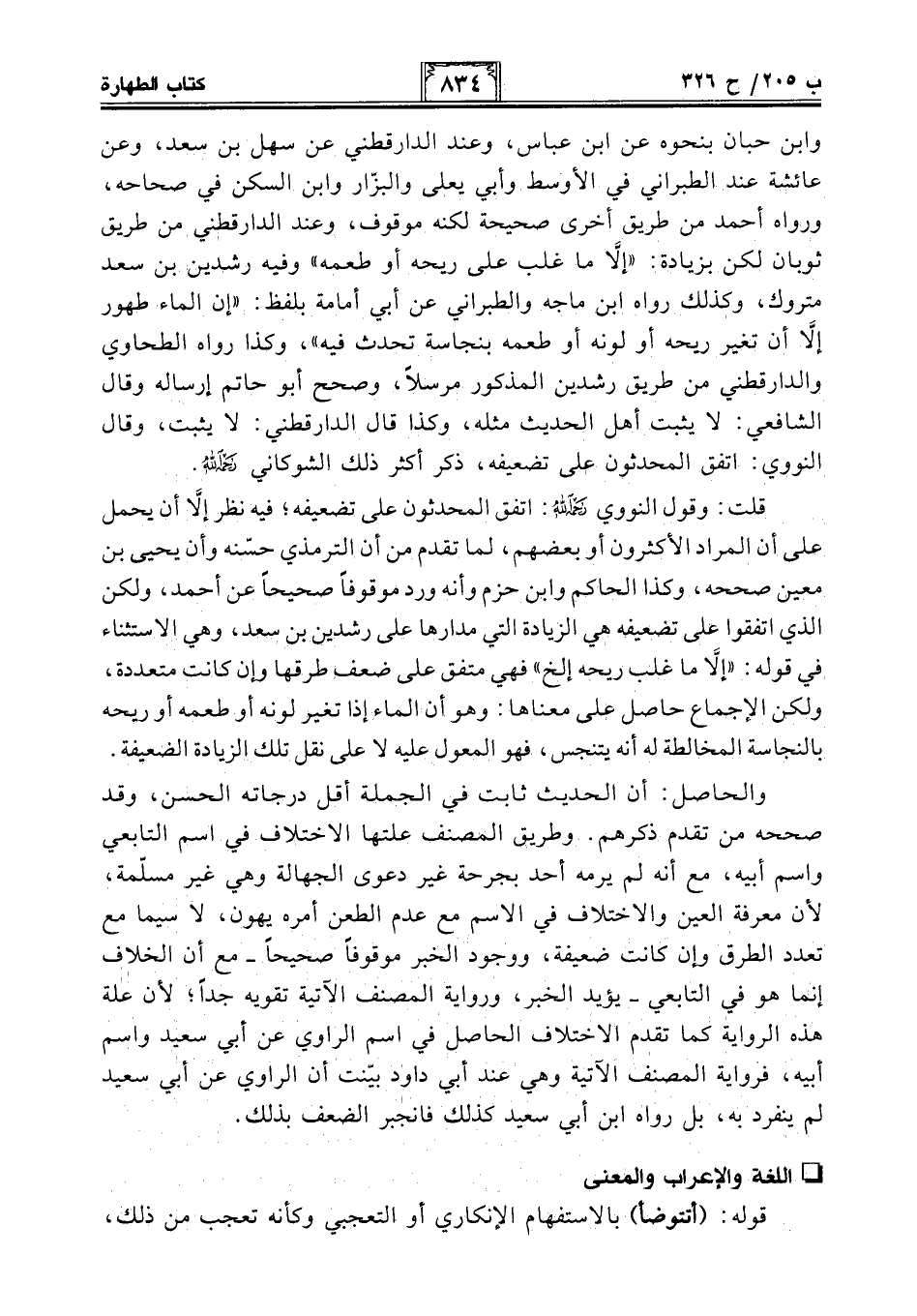 قلت: وقول النووي -رحمه الله-: اتفق المحدثون على تضعيفه؛ فيه نظر إلَّا أن يحمل على أن المراد الأكثرون أو بعضهم، لما تقدم من أن الترمذي حسّنه وأن يحيى بن معين صححه، وكذا الحاكم وابن حزم وأنه ورد موقوفًا صحيحًا عن أحمد، ولكن الذي اتفقوا على تضعيفه هي الزيادة التي مدارها على رشدين بن سعد، وهي الإستثناء في قوله: "إلَّا ما غلب ريحه إلخ" فهي متفق على ضعف طرقها وإن كانت متعددة، ولكن الإجماع حاصل على معناها: وهو أن الماء إذا تغير لونه أو طعمه أو ريحه بالنجاسة المخالطة له أنه يتنجس، فهو المعول عليه لا على نقل تلك الزيادة الضعيفة.