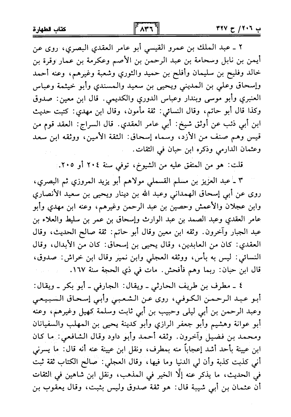 4 - مطرف بن طريف الحارثي -ويقال: الجارفي- أبو بكر -ويقال: أبو عبد الرحمن الكوفي، روى عن الشعبي وأبي إسحاق السبيعي وعبد الرحمن بن أبي ليلى وحبيب بن أبي ثابت وسلمة كهيل وغيرهم، وعنه أبو عوانة وهشيم وأبو جعفر الرازي وأبو كدينة يحيى بن المهلب والسفيانان ومحمد بن فضيل وآخرون. وثقه أحمد وأبو داود وقال الشافعي: ما كان ابن عيينة بأحد أشد إعجابًا منه بمطرف، ونقل ابن عيينة عنه أنه قال: ما يسرني أني كذبت كذبة وأن لي الدنيا وما فيها، وقال العجلي: صالح الكتاب ثقة ثبت في الحديث، ما يذكر عنه إلَّا الخير في المذهب، ونقل ابن شاهين في الثقات أن عثمان بن أبي شيبة قال: هو ثقة صدوق وليس بثبت، وقال يعقوب بن