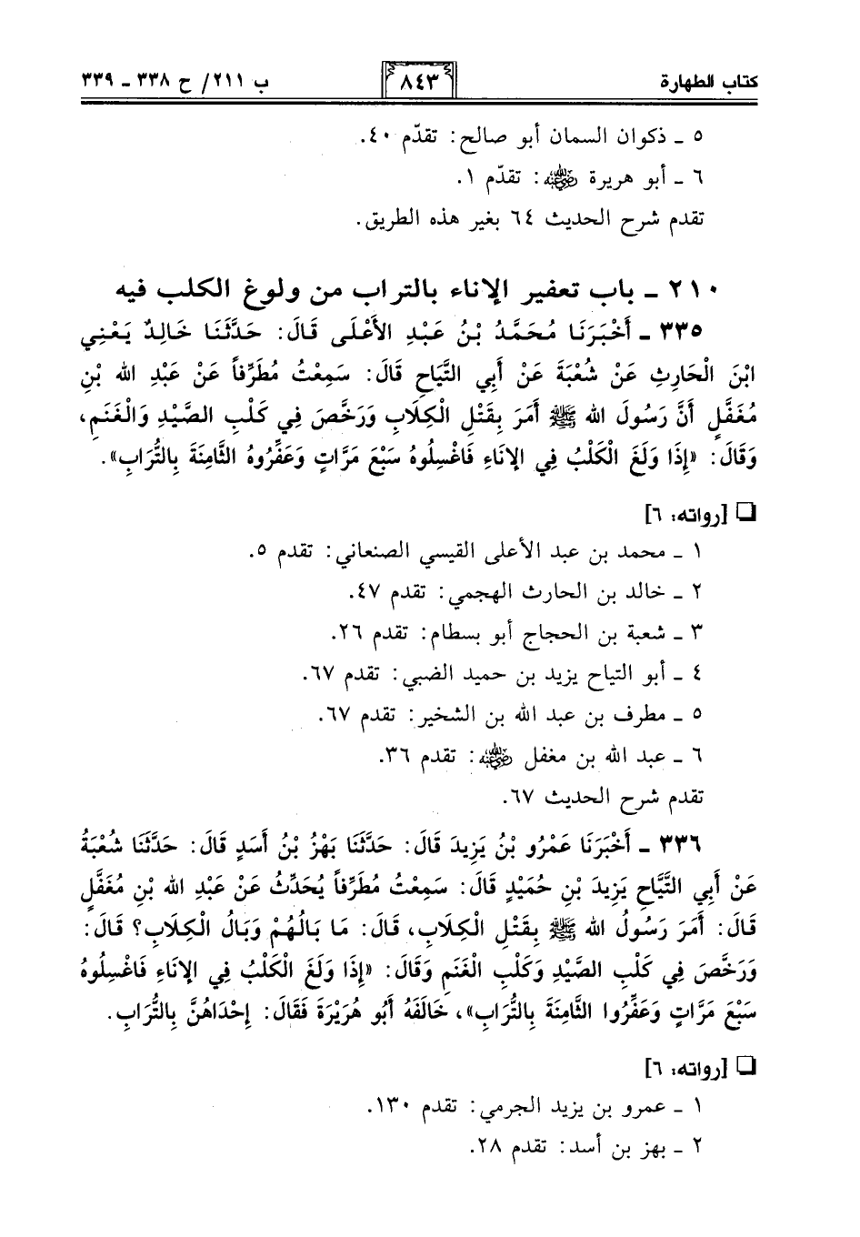 336 - أَخْبَرَنَا عَمْرُو بْنُ يَزِيدَ قَالَ: حَدَّثَنَا بَهْزُ بْنُ أَسَدٍ قَالَ: حَدَّثَنَا شُعْبَةُ عَنْ أَبِي التَّيَّاحِ يَزِيدَ بْنِ حُمَيْدٍ قَالَ: سَمِعْتُ مُطَرِّفًا يُحَدِّثُ عَنْ عَبْدِ اللَّهِ بْنِ مُغَفَّلٍ قَالَ: أَمَرَ رَسُولُ اللَّهِ - صلى الله عليه وسلم - بِقَتْلِ الْكِلَابِ، قَالَ: مَا بَالُهُمْ وَبَالُ الْكِلَابِ؟ قَالَ: وَرَخَّصَ فِي كَلْبِ الصَّيْدِ وَكَلْبِ الْغَنَمِ وَقَالَ: "إِذَا وَلَغَ الْكَلْبُ فِي الإِنَاءِ فَاغْسِلُوهُ سَبْعَ مَرَّاتٍ وَعَفِّرُوا الثَّامِنَةَ بِالتُّرَابِ". خَالَفَهُ أَبُو هُرَيْرَةَ فَقَالَ: إِحْدَاهُنَّ بِالتُّرَابِ.
