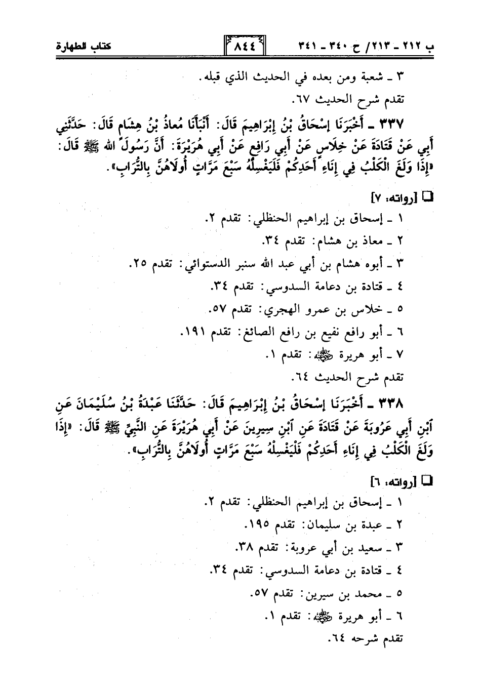 338 - أَخْبَرَنَا إِسْحَاقُ بْنُ إِبْرَاهِيمَ قَالَ: حَدَّثَنَا عَبْدَةُ بْنُ سُلَيْمَانَ عَنِ ابْنِ أَبِي عَرُوبَةَ عَنْ قَتَادَةَ عَنِ ابْنِ سِيرِينَ عَنْ أَبِي هُرَيْرَةَ عَنِ النَّبِيِّ - صلى الله عليه وسلم - قَالَ: "إِذَا وَلَغَ الْكَلْبُ فِي إِنَاءِ أَحَدِكُمْ فَلْيَغْسِلْهُ سَبْعَ مَرَّاتٍ أُولَاهُنَّ بِالتُّرَابِ".