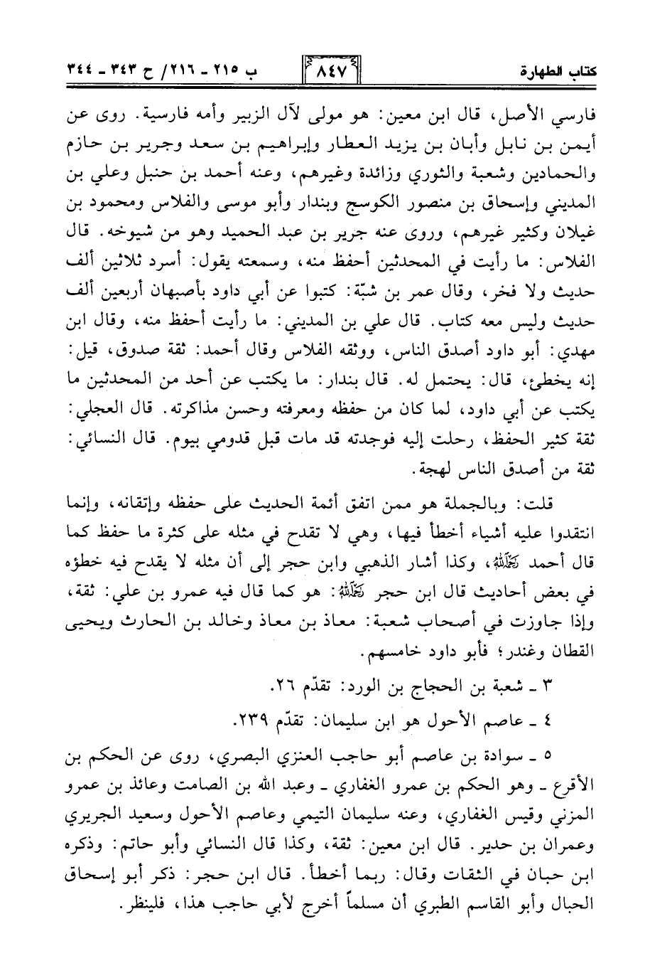 5 - سوادة بن عاصم أبو حاجب العنزي البصري، روى عن الحكم بن الأقرع -وهو الحكم بن عمرو الغفاري- وعبد الله بن الصامت وعائذ بن عمرو المزني وقيس الغفاري، وعنه سليمان التيمي وعاصم الأحول وسعيد الجريري وعمران بن حدير. قال ابن معين: ثقة، وكذا قال النسائي وأبو حاتم: وذكره ابن حبان في الثقات وقال: ربما أخطأ. قال ابن حجر: ذكر أبو إسحاق الحبال وأبو القاسم الطبري أن مسلمًا أخرج لأبي حاجب هذا، فلينظر.
