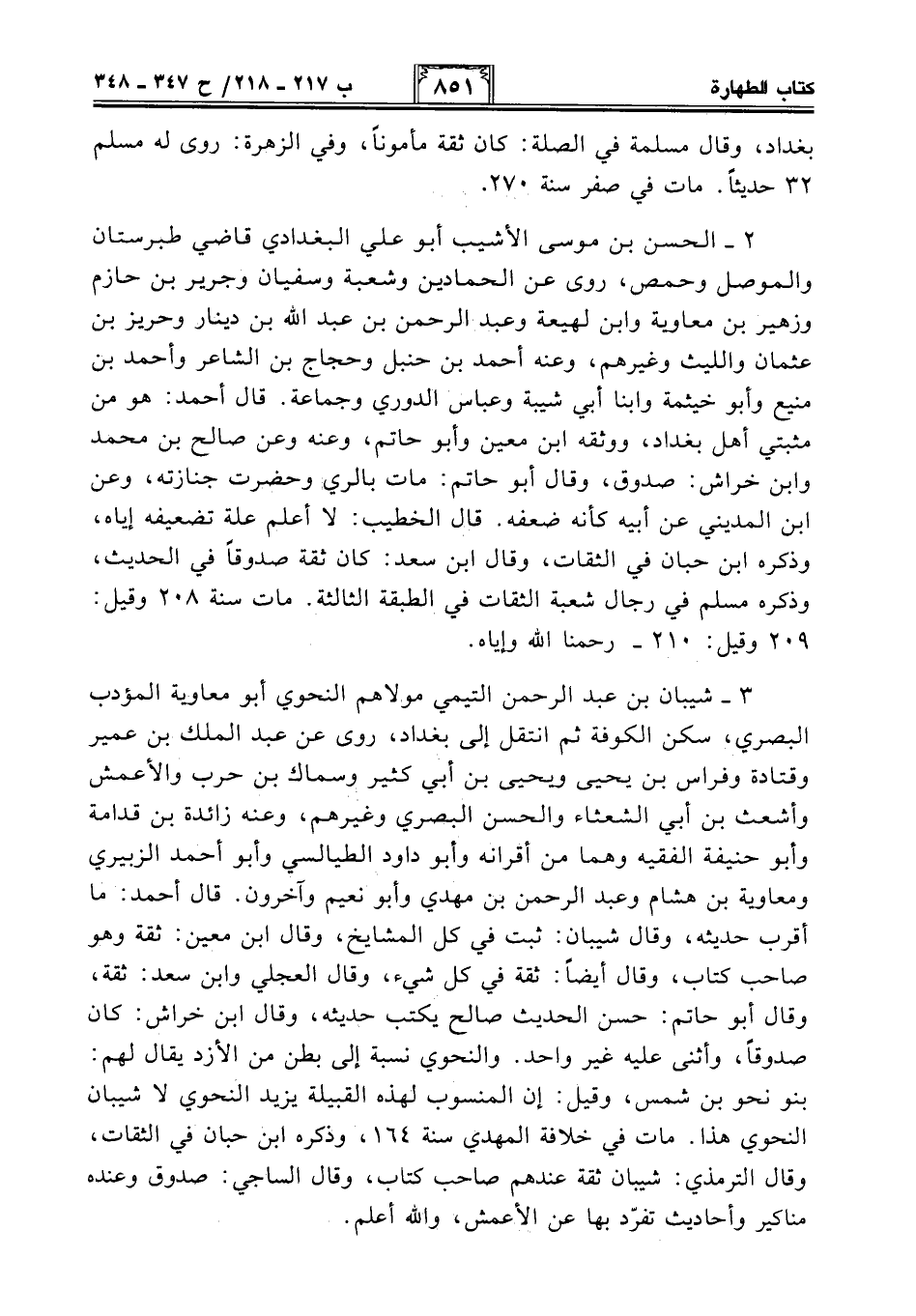 2 - الحسن بن موسى الأشيب أبو علي البغدادي قاضي طبرستان والموصل وحمص، روى عن الحمادين وشعبة وسفيان وجرير بن حازم وزهير بن معاوية وابن لهيعة وعبد الرحمن بن عبد الله بن دينار وحريز بن عثمان والليث وغيرهم، وعنه أحمد بن حنبل وحجاج بن الشاعر وأحمد بن منيع وأبو خيثمة وابنا أبي شيبة وعباس الدوري وجماعة. قال أحمد: هو من مثبتي أهل بغداد، ووثقه ابن معين وأبو حاتم، وعنه وعن صالح بن محمَّد وابن خراش: صدوق، وقال أبو حاتم: مات بالري وحضرت جنازته، وعن ابن المديني عن أبيه كأنه ضعفه. قال الخطيب: لا أعلم علة تضعيفه إياه، وذكره ابن حبان في الثقات، وقال ابن سعد: كان ثقة صدوقًا في الحديث، وذكره مسلم في رجال شعبة الثقات في الطبقة الثالثة. مات سنة 208 وقيل: 209 وقيل: 210 - رحمنا الله وإياه.