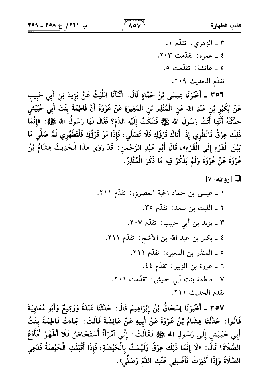 357 - أَخْبَرَنَا إِسْحَاقُ بْنُ إِبْرَاهِيمَ قَالَ: حَدَّثَنَا عَبْدَةُ وَوَكِيعٌ وَأَبُو مُعَاوِيَةَ قَالُوا: حَدَّثَنَا هِشَامُ بْنُ عُرْوَةَ عَنْ أَبِيهِ عَنْ عَائِشَةَ قَالَتْ: جَاءَتْ فَاطِمَةُ بِنْتُ أَبِي حُبَيْشٍ إِلَى رَسُولِ اللَّهِ - صلى الله عليه وسلم - فَقَالَتْ: إِنِّي امْرَأَةٌ أُسْتَحَاضُ فَلَا أَطْهُرُ أَفَأَدَعُ الصَّلَاةَ؟ قَالَ: "لَا إِنَّمَا ذَلِكِ عِرْقٌ وَلَيْسَتْ بِالْحِيضَةِ، فَإِذَا أَقْبَلَتِ الْحِيضَةُ فَدَعِي الصَّلَاةَ وَإِذَا أَدْبَرَتْ فَاغْسِلِي عَنْكِ الدَّمَ وَصَلِّي".