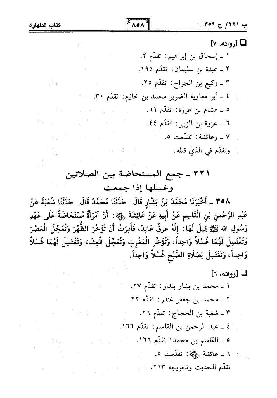 358 - أَخْبَرَنَا مُحَمَّدُ بْنُ بَشَّارٍ قَالَ: حَدَّثَنَا مُحَمَّدٌ قَالَ: حَدَّثَنَا شُعْبَةُ عَنْ عَبْدِ الرَّحْمَنِ بْنِ الْقَاسِمِ عَنْ أَبِيهِ عَنْ عَائِشَةَ -رضي الله عنها-: أَنَّ امْرَأَةً مُسْتَحَاضَةً عَلَى عَهْدِ رسول الله - صلى الله عليه وسلم - قِيلَ لَهَا: إِنَّهُ عِرْقٌ عَانِدٌ، فَأُمِرَتْ أَنْ تُؤَخِّرَ الظُّهْرَ وَتُعَجِّلَ الْعَصْرَ وَتَغْتَسِلَ لَهُمَا غُسْلًا وَاحِدًا، وَتُؤَخِّرَ الْمَغْرِبَ وَتُعَجِّلَ الْعِشَاءَ وَتَغْتَسِلَ لَهُمَا غُسْلًا وَاحِدًا، وَتَغْتَسِلَ لِصَلَاةِ الصُّبْحِ غُسْلًا وَاحِدًا.