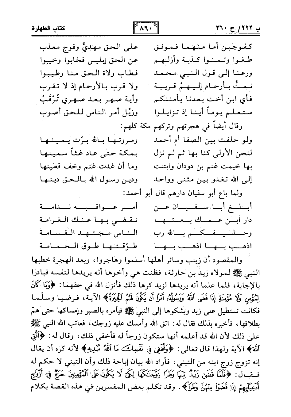 والمقصود أن زينب وسائر أهلها أسلموا وهاجروا، وبعد الهجرة خطبها النبي - صلى الله عليه وسلم - لمولاه زيد بن حارثة، فظنت هي وأخوها أنه يريدها لنفسه فبادرا بالإجابة، فلما علما أنه يريدها لزيد كرها ذلك فأنزل الله في حقهما: {وَمَا كَانَ لِمُؤْمِنٍ وَلَا مُؤْمِنَةٍ إِذَا قَضَى اللَّهُ وَرَسُولُهُ أَمْرًا أَنْ يَكُونَ لَهُمُ الْخِيَرَةُ} الآية، فرضيا وسلّما فكانت تستطيل على زيد ويشكوها إلى النبي - صلى الله عليه وسلم - فيأمره بالصبر وإمساكها حتى همّ بطلاقها، فأخبره بذلك فقال له: اتق الله وأمسك عليه زوجك، فعاتب الله النبي - صلى الله عليه وسلم - على ذلك لأن الله قد أعلمه أنها ستكون زوجًا له فأخفى ذلك، وقال له: {اتَّقِ اللَّهَ} الآية ولهذا قال تعالى: {وَتُخْفِي فِي نَفْسِكَ مَا اللَّهُ مُبْدِيهِ} لأنه كره أن يقال إنه تزوج زوج ابنه من التبني، فأراد الله بيان إباحة ذلك وأن التبني لا حكم له فقال: {فَلَمَّا قَضَى زَيْدٌ مِنْهَا وَطَرًا زَوَّجْنَاكَهَا لِكَيْ لَا يَكُونَ عَلَى الْمُؤْمِنِينَ حَرَجٌ فِي أَزْوَاجِ أَدْعِيَائِهِمْ إِذَا قَضَوْا مِنْهُنَّ وَطَرًا}. وقد تكلم بعض المفسرين في هذه القصة بكلام