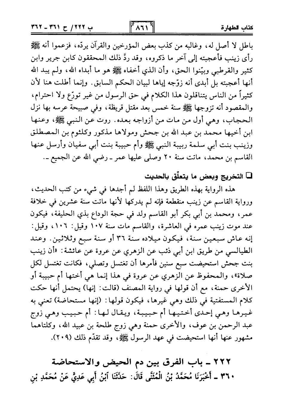 هذه الرواية بهذه الطريق وهذا اللفظ لم أجدها في شيء من كتب الحديث، ورواية القاسم عن زينب منقطعة فإنه لم يدركها لأنها ماتت سنة عشرين في خلافة عمر، ومحمد بن أبي بكر أبو القاسم ولد في حجة الوداع بذي الحليفة، فيكون عند موت زينب عمره في العاشرة، والقاسم مات سنة 107 وقيل: 106، وقيل: إنه عاش سبعين سنة، فيكون ميلاده سنة 36 أو سنة سبع وثلاثين. وعند الطيالسي من طريق ابن أبي ذئب عن الزهري عن عروة عن عائشة: "أن زينب بنت جحش استحيضت سبع سنين فأمرها أن تغتسل وتصلي، فكانت تغتسل لكل صلاة"، والمحفوظ عن الزهري عن عروة في هذا إنما هي أختها أم حبيبة أو الأخرى حمنة، مع أن قولها في رواية المصنف (قالت: إنها) يحتمل أنها حكت كلام المستفتية في ذلك وهي غيرها، فيكون قولها: (إنها مستحاضة) تعني به غيرها وهي إحدى أختيها أم حبيبة، ويقال لها: أم حبيب وهي زوج عبد الرحمن بن عوف، والأخرى حمنة وهي زوج طلحة بن عبيد الله، وكلتاهما مشهور عنها أنها استحيضت في عهد الرسول - صلى الله عليه وسلم -، وقد تقدّم ذلك (209).