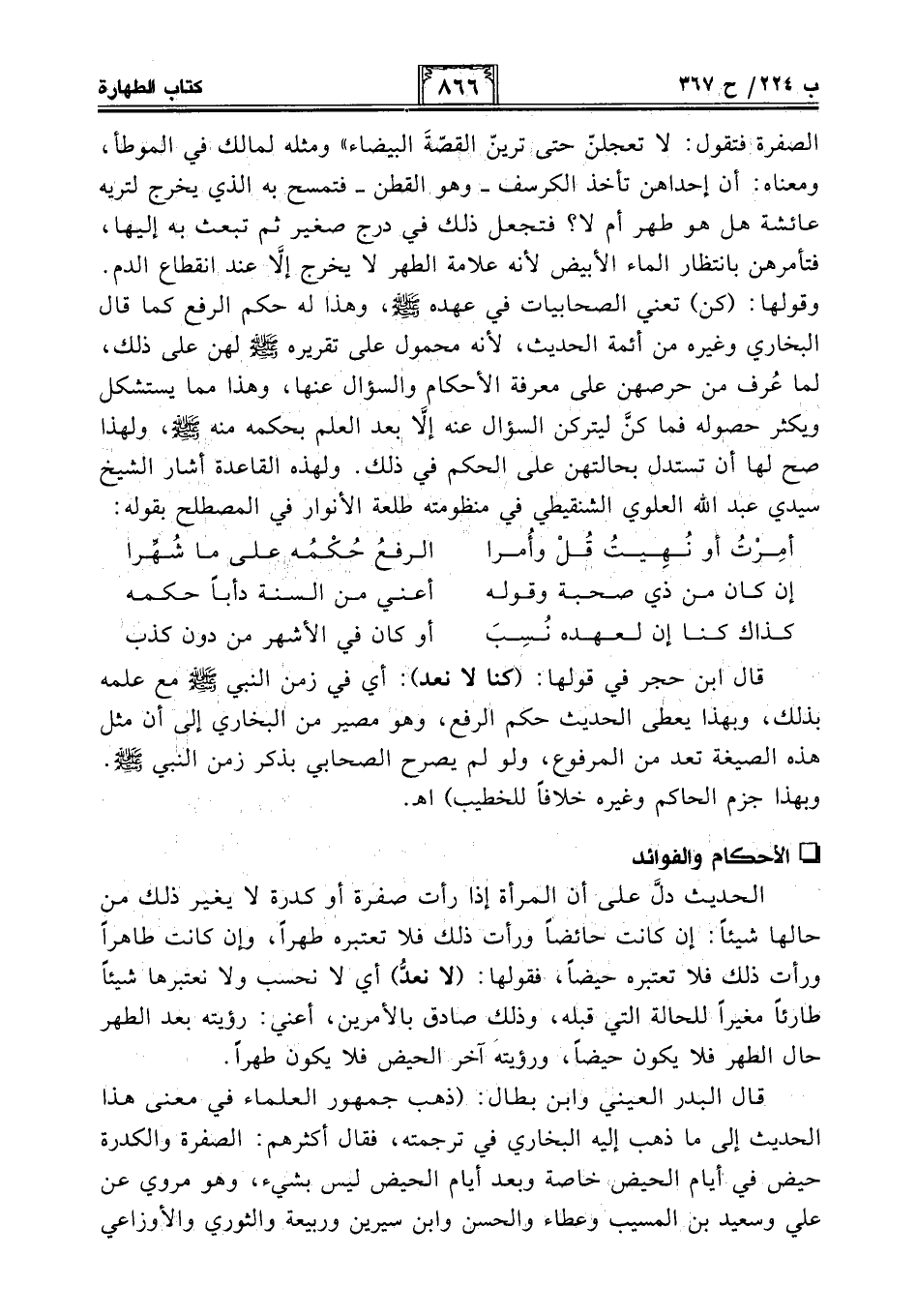 الصفرة فتقول: لا تعجلنّ حتى ترينّ القصّةَ البيضاء" ومثله لمالك في الموطأ، ومعناه: أن إحداهن تأخذ الكرسف -وهو القطن- فتمسح به الذي يخرج لتريه عائشة هل هو طهر أم لا؟ فتجعل ذلك في درج صغير ثم تبعث به إليها، فتأمرهن بانتظار الماء الأبيض لأنه علامة الطهر لا يخرج إلا عند إنقطاع الدم. وقولها: (كن) تعني الصحابيات في عهده - صلى الله عليه وسلم -، وهذا له حكم الرفع كما قال البخاري وغيره من أئمة الحديث, لأنه محمول على تقريره - صلى الله عليه وسلم - لهن على ذلك، لما عُرف من حرصهن على معرفة الأحكام والسؤال عنها، وهذا مما يستشكل ويكثر حصوله فما كن ليتركن السؤال عنه إلا بعد العلم بحكمه منه - صلى الله عليه وسلم -، ولهذا صح لها أن تستدل بحالتهن على الحكم في ذلك. ولهذه القاعدة أشار الشيخ سيدي عبد الله العلوي الشنقيطي في منظومته طلعة الأنوار في المصطلح بقوله: