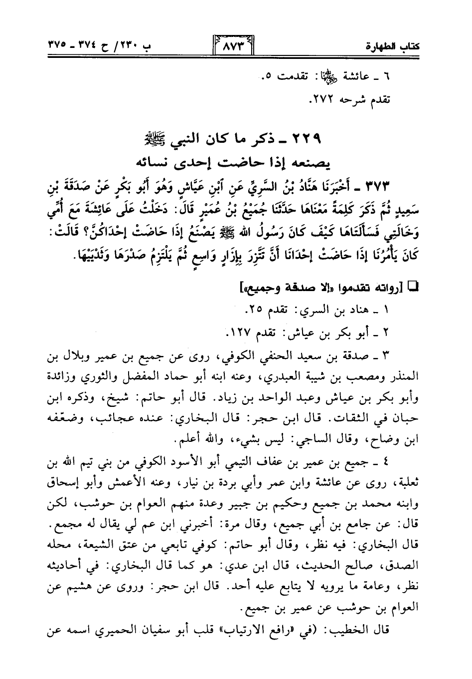 373 - أَخْبَرَنَا هَنَّادُ بْنُ السَّرِيِّ عَنِ ابْنِ عَيَّاشٍ وَهُوَ أَبُو بَكْرٍ عَنْ صَدَقَةَ بْنِ سَعِيدٍ ثُمَّ ذَكَرَ كَلِمَةً مَعْنَاهَا حَدَّثَنَا جُمَيْعُ بْنُ عُمَيْرٍ قَالَ: دَخَلْتُ عَلَى عَائِشَةَ مَعَ أُمِّي وَخَالَتِي فَسَأَلَتَاهَا كَيْفَ كَانَ رَسُولُ اللَّهِ - صلى الله عليه وسلم - يَصْنَعُ إِذَا حَاضَتْ إِحْدَاكُنَّ؟ قَالَتْ: كَانَ يَأْمُرُنَا إِذَا حَاضَتْ إِحْدَانَا أَنْ تَتَّزِرَ بِإِزَارٍ وَاسِعٍ ثُمَّ يَلْتَزِمُ صَدْرَهَا وَثَدْيَيْهَا.