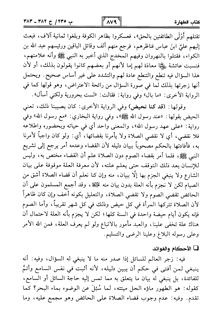 تقتلهم أَوْلَى الطائفتين بالحق"، فعسكروا بظاهر الكوفة وبلغوا ثمانية آلاف، فبعث إليهم عليٌ ابنَ عباس فناظرهم، فرجع منهم ألف وقاتل الباقين ورئيسهم عبد الله بن الكواء، فقتلوا بالنهروان وفيهم المخدج الذي أخبر به النبي - صلى الله عليه وسلم - وأنه علامتهم، فنسبت عائشة -رضي الله عنها- معاذة لهم إما لأنهم أو بعضهم كانوا يقولون بذلك، أو لأن هذا السؤال فيه تنطع والتنطع عادة لهم والتشدد على غير أساس صحيح. ويحتمل أنها زجرتها بذلك لما في صورة السؤال من رائحة الإعتراض، وهو قولها كما في الرواية الأخرى: "ما بال" وفي رواية: فقالت: "لست بحرورية ولكني أسأل".