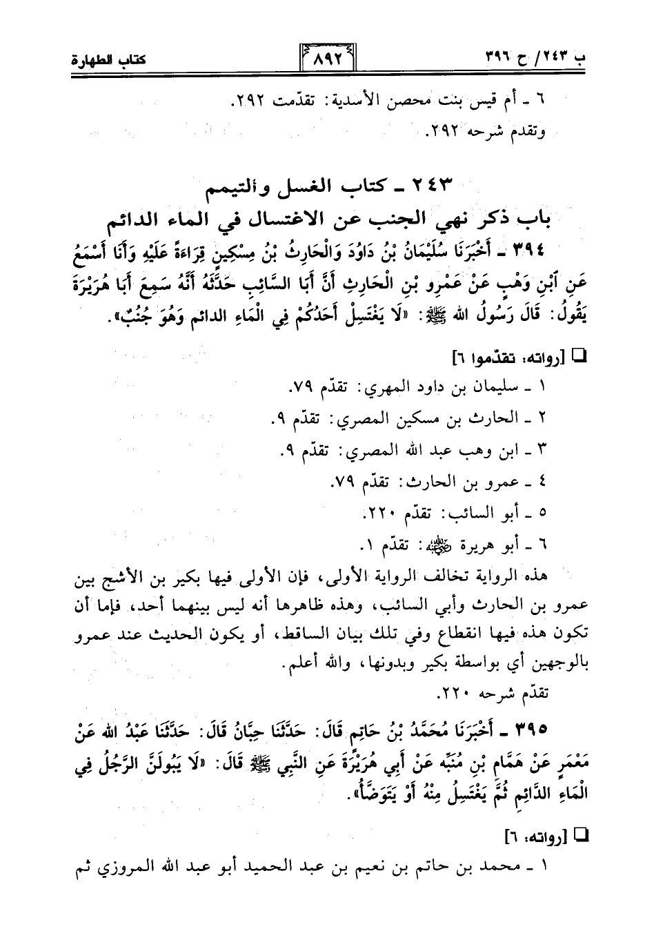 395 - أَخْبَرَنَا مُحَمَّدُ بْنُ حَاتِمٍ قَالَ: حَدَّثَنَا حِبَّانُ قَالَ: حَدَّثَنَا عَبْدُ اللَّهِ عَنْ مَعْمَرٍ عَنْ هَمَّامِ بْنِ مُنَبِّهٍ عَنْ أَبِي هُرَيْرَةَ عَنِ النَّبِيِّ - صلى الله عليه وسلم - قَالَ: "لَا يَبُولَنَّ الرَّجُلُ فِي الْمَاءِ الدَّائِمِ ثُمَّ يَغْتَسِلُ مِنْهُ أَوْ يَتَوَضَّأُ".