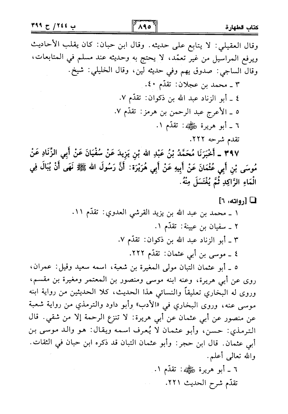 397 - أَخْبَرَنَا مُحَمَّدُ بْنُ عَبْدِ اللَّهِ بْنِ يَزِيدَ عَنْ سُفْيَانَ عَنْ أَبِي الزِّنَادِ عَنْ مُوسَى بْنِ أَبِي عُثْمَانَ عَنْ أَبِيهِ عَنْ أَبِي هُرَيْرَةَ: أَنَّ النَّبِيَّ - صلى الله عليه وسلم - نَهَى أَنْ يُبَالَ فِي الْمَاءِ الرَّاكِدِ ثُمَّ يُغْتَسَلَ مِنْهُ.