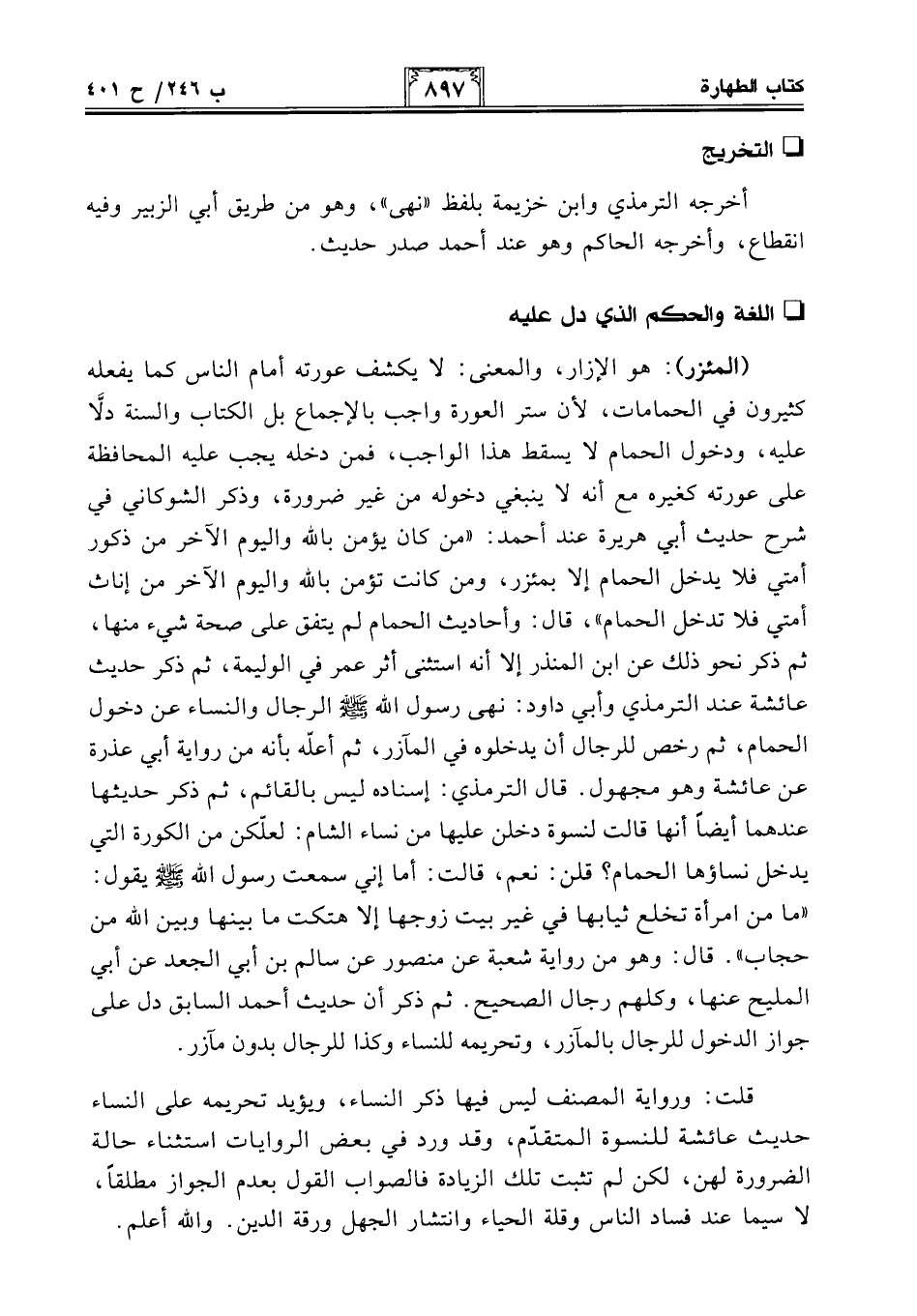 (المئزر): هو الإزار، والمعنى: لا يكشف عورته أمام الناس كما يفعله كثيرون في الحمامات، لأن ستر العورة واجب بالإجماع بل الكتاب والسنة دلَّا عليه، ودخول الحمام لا يسقط هذا الواجب، فمن دخله يجب عليه المحافظة على عورته كغيره مع أنه لا ينبغي دخوله من غير ضرورة، وذكر الشوكاني في شرح حديث أبي هريرة عند أحمد: "من كان يؤمن بالله واليوم الآخر من ذكور أمتي فلا يدخل الحمام إلا بمئزر، ومن كانت تؤمن بالله واليوم الآخر من إناث أمتي فلا تدخل الحمام"، قال: وأحاديث الحمام لم يتفق على صحة شيء منها، ثم ذكر نحو ذلك عن ابن المنذر إلا أنه استثنى أثر عمر في الوليمة، ثم ذكر حديث عائشة عند الترمذي وأبي داود: نهى رسول الله - صلى الله عليه وسلم - الرجال والنساء عن دخول الحمام، ثم رخص للرجال أن يدخلوه في المآزر، ثم أعلّه بأنه من رواية أبي عذرة عن عائشة وهو مجهول. قال الترمذي: إسناده ليس بالقائم، ثم ذكر حديثها عندهما أيضًا أنها قالت لنسوة دخلن عليها من نساء الشام: لعلكن من الكورة التي يدخل نساؤها الحمام؟ قلن: نعم، قالت: أما إني سمعت رسول الله - صلى الله عليه وسلم - يقول: "ما من امرأة تخلع ثيابها في غير بيت زوجها إلا هتكت ما بينها وبين الله من حجاب". قال: وهو من رواية شعبة عن منصور عن سالم بن أبي الجعد عن أبي المليح عنها، وكلهم رجال الصحيح. ثم ذكر أن حديث أحمد السابق دل على جواز الدخول للرجال بالمآزر، وتحريمه للنساء وكذا للرجال بدون مآزر.