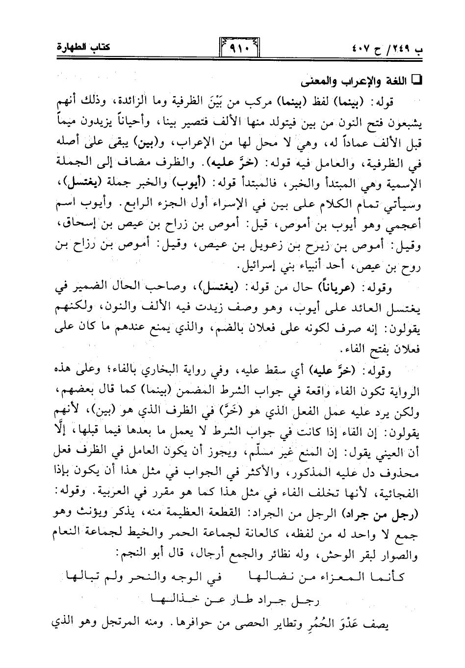 قوله: (بينما) لفظ (بينما) مركب من بَيْنَ الظرفية وما الزائدة، وذلك أنهم يشبعون فتح النون من بين فيتولد منها الألف فتصير بينا، وأحيانًا يزيدون ميمًا قبل الألف عمادًا له، وهي لا محل لها من الإعراب، و (بين) يبقى على أصله في الظرفية، والعامل فيه قوله: (خر عليه). والظرف مضاف إلى الجملة الإسمية وهي المبتدأ والخبر، فالمبتدأ قوله: (أيوب) والخبر جملة (يغتسل)، وسيأتي تمام الكلام على بين في الإسراء أول الجزء الرابع. وأيوب اسم أعجمي وهو أيوب بن أموص، قيل: أموص بن زراح بن عيص بن إسحاق، وقيل: أموص بن زيرح بن زعويل بن عيص، وقيل: أموص بن رزاح بن روح بن عيص، أحد أنبياء بني إسرائيل.