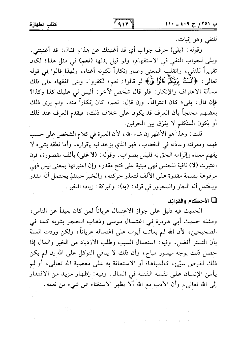 وقوله: (بلى) حرف جواب أي قد أغنيتك عن هذا، فقال: قد أغنيتني. وبلى لجواب النفي في الإستفهام، ولو قيل بدلها (نعم) في مثل هذا؛ لكان تقريرًا للنفي، وانقلب المعنى وصار إنكارًا لكونه أغناه، ولهذا قالوا في قوله تعالى: {أَلَسْتُ بِرَبِّكُمْ قَالُوا بَلَى} لو قالوا: نعم؛ لكفروا، وبنى الفقهاء على ذلك مسألة الإعتراف والإنكار: فلو قال شخص لآخر: أليس لي عليك كذا وكذا؟ فإن قال: بلى؛ كان اعترافًا، وإن قال: نعم؛ كان إنكارًا منه، ولم يرى ذلك بعضهم محتجًا بأن العرف قد يكون على خلاف ذلك، فيقدم العرف عند ذلك أو يكون المتكلم لا يفرّق بين الحرفين.