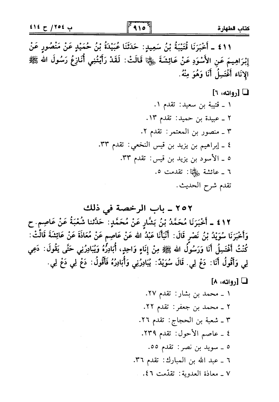 411 - أَخْبَرَنَا قُتَيْبَةُ بْنُ سَعِيدٍ: حَدَّثَنَا عَبِيدَةُ بْنُ حُمَيْدٍ عَنْ مَنْصُورٍ عَنْ إِبْرَاهِيمَ عَنِ الأَسْوَدِ عَنْ عَائِشَةَ -رضي الله عنها- قَالَتْ: لَقَدْ رَأَيْتُنِي أُنَازِعُ رَسُولَ اللَّهِ - صلى الله عليه وسلم - الإِنَاءَ أَغْتَسِلُ أَنَا وَهُوَ مِنْهُ.
