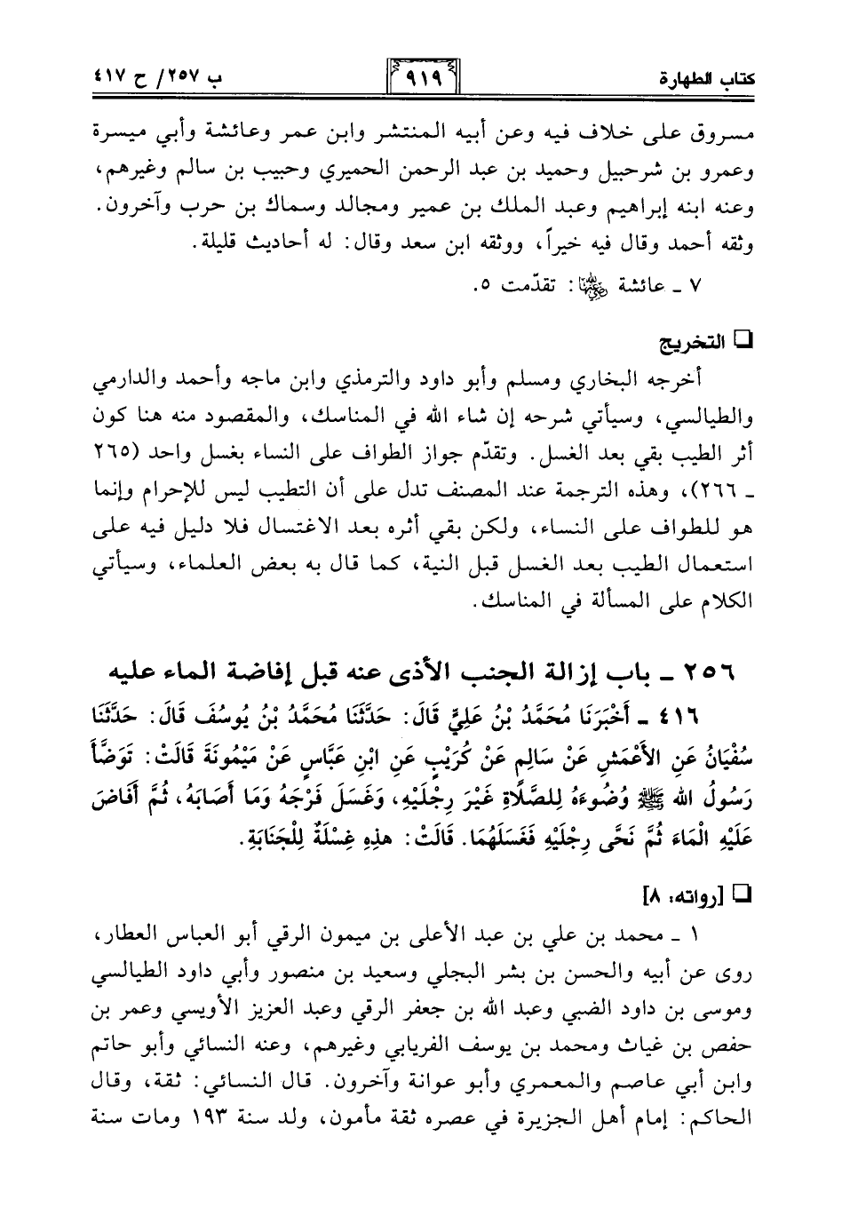 أخرجه البخاري ومسلم وأبو داود والترمذي وابن ماجه وأحمد والدارمي والطيالسي، وسيأتي شرحه إن شاء الله في المناسك، والمقصود منه هنا كون أثر الطيب بقي بعد الغسل. وتقدّم جواز الطواف على النساء بغسل واحد (265 - 266)، وهذه الترجمة عند المصنف تدل على أن التطيب ليس للإحرام وإنما هو للطواف على النساء، ولكن بقي أثره بعد الإغتسال فلا دليل فيه على استعمال الطيب بعد الغسل قبل النية، كما قال به بعض العلماء، وسيأتي الكلام على المسألة في المناسك.