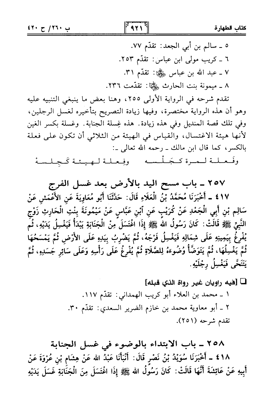 تقدم شرحه في الرواية الأولى 255، وهنا بعض ما ينبغي التنبيه عليه وهو أن هذه الرواية مختصرة، وفيها زيادة التصريح بتأخيره لغسل الرجلين، وفي تلك قصة المنديل وفي هذه زيادة. هذه غِسلة الجنابة. وغسلة بكسر الغين لأنها هيئة الإغتسال، والقياس في الهيئة من الثلاثي أن تكون على فعلة بالكسر، كما قال ابن مالك -رحمه الله تعالى-