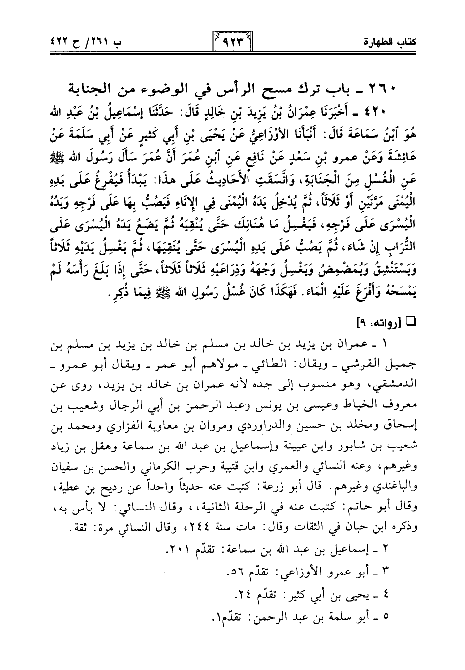 1 - عمران بن يزيد بن خالد بن مسلم بن خالد بن يزيد بن مسلم بن جميل القرشي -ويقال: الطائي- مولاهم أبو عمر -ويقال أبو عمرو- الدمشقي، وهو منسوب إلى جده لأنه عمران بن خالد بن يزيد، روى عن معروف الخياط وعيسى بن يونس وعبد الرحمن بن أبي الرجال وشعيب بن إسحاق ومخلد بن حسين والدراوردي ومروان بن معاوية الفزاري ومحمد بن شعيب بن شابور وابن عيينة وإسماعيل بن عبد الله بن سماعة وهقل بن زياد وغيرهم، وعنه النسائي والعمري وابن قتيبة وحرب الكرماني والحسن بن سفيان والباغندي وغيرهم. قال أبو زرعة: كتبت عنه حديثًا واحدًا عن رديح بن عطية، وقال أبو حاتم: كتبت عنه في الرحلة الثانية، ، وقال النسائي: لا بأس به، وذكره ابن حبان في الثقات وقال: مات سنة 244، وقال النسائي مرة: ثقة.