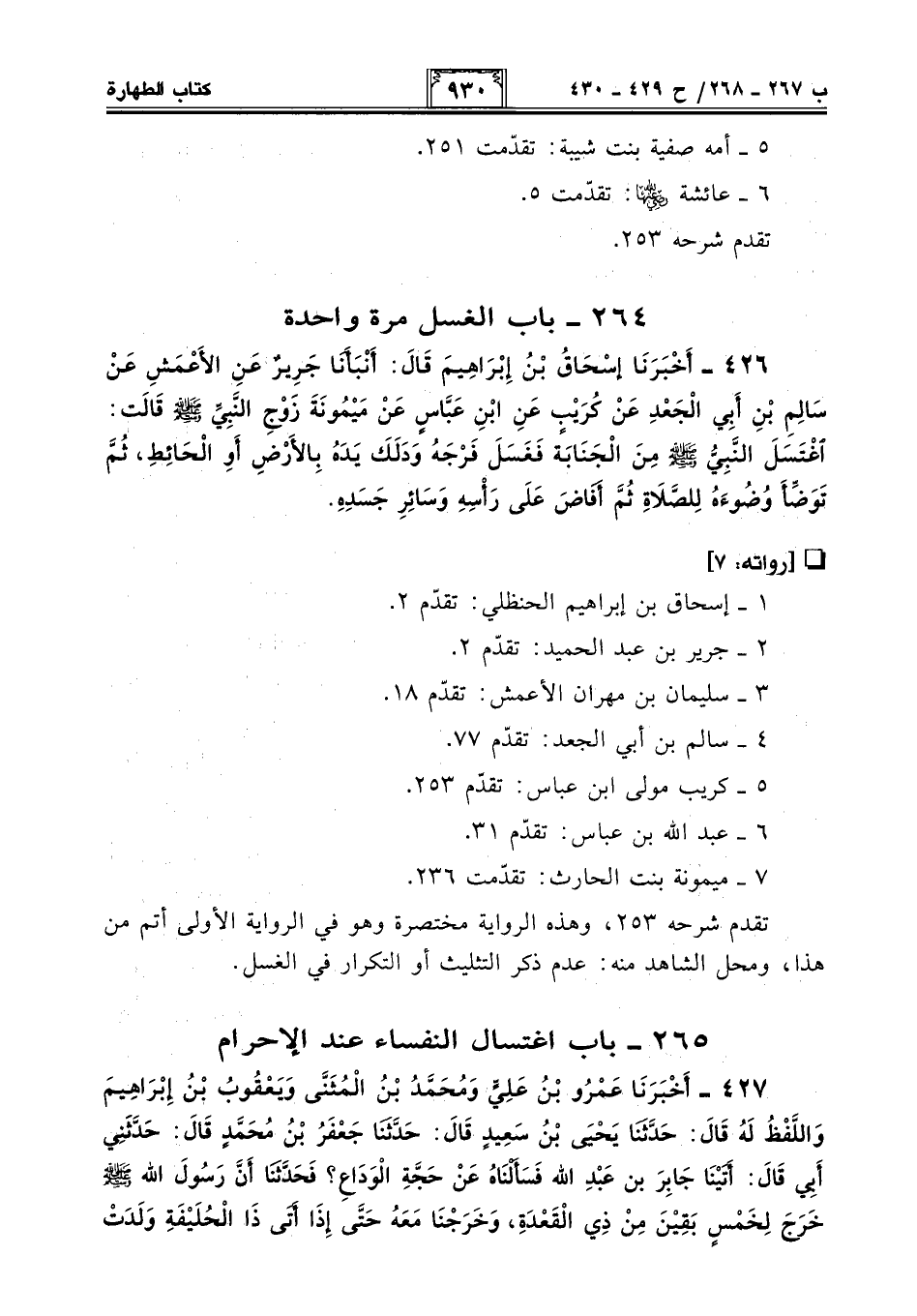 تقدم شرحه 253، وهذه الرواية مختصرة وهو في الرواية الأولى أتم من هذا، ومحل الشاهد منه: عدم ذكر التثليث أو التكرار في الغسل.