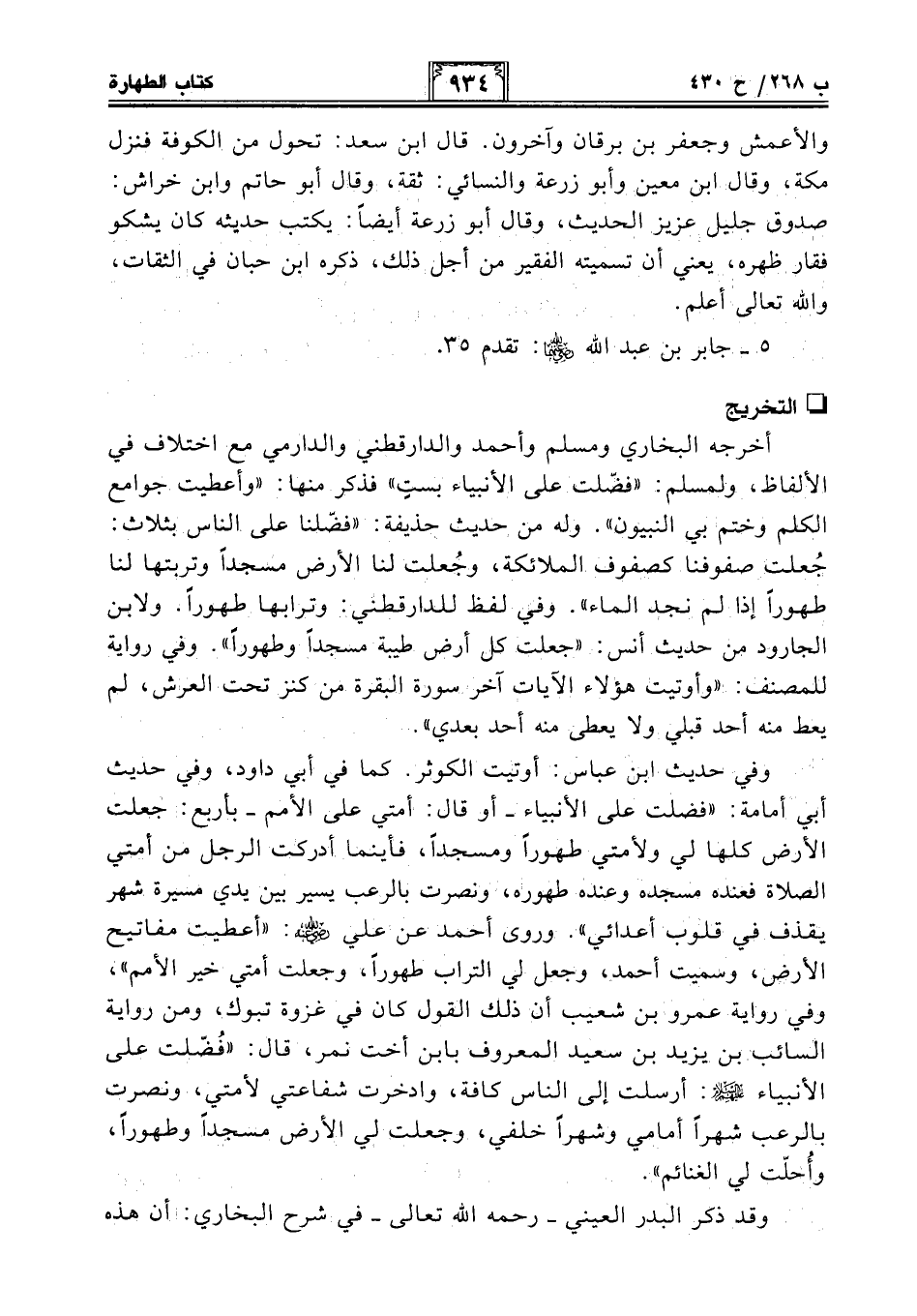 أخرجه البخاري ومسلم وأحمد والدارقطني والدارمي مع اختلاف في الألفاظ، ولمسلم: "فضلت على الأنبياء بستٍ" فذكر منها: "وأعطيت جوامع الكلم وختم بي النبيون". وله من حديث حذيفة: "فضلنا على الناس بثلاث: جُعلت صفوفنا كصفوف الملائكة، وجُعلت لنا الأرض مسجدًا وتربتها لنا طهورًا إذا لم نجد الماء". وفي لفظ للدارقطني: وترابها طهورًا. ولابن الجارود من حديث أنس: "جعلت كل أرض طيبة مسجدًا وطهورًا". وفي رواية للمصنف: "وأوتيت هؤلاء الآيات آخر سورة البقرة من كنز تحت العرش، لم يعط منه أحد قبلي ولا يعطى منه أحد بعدي".