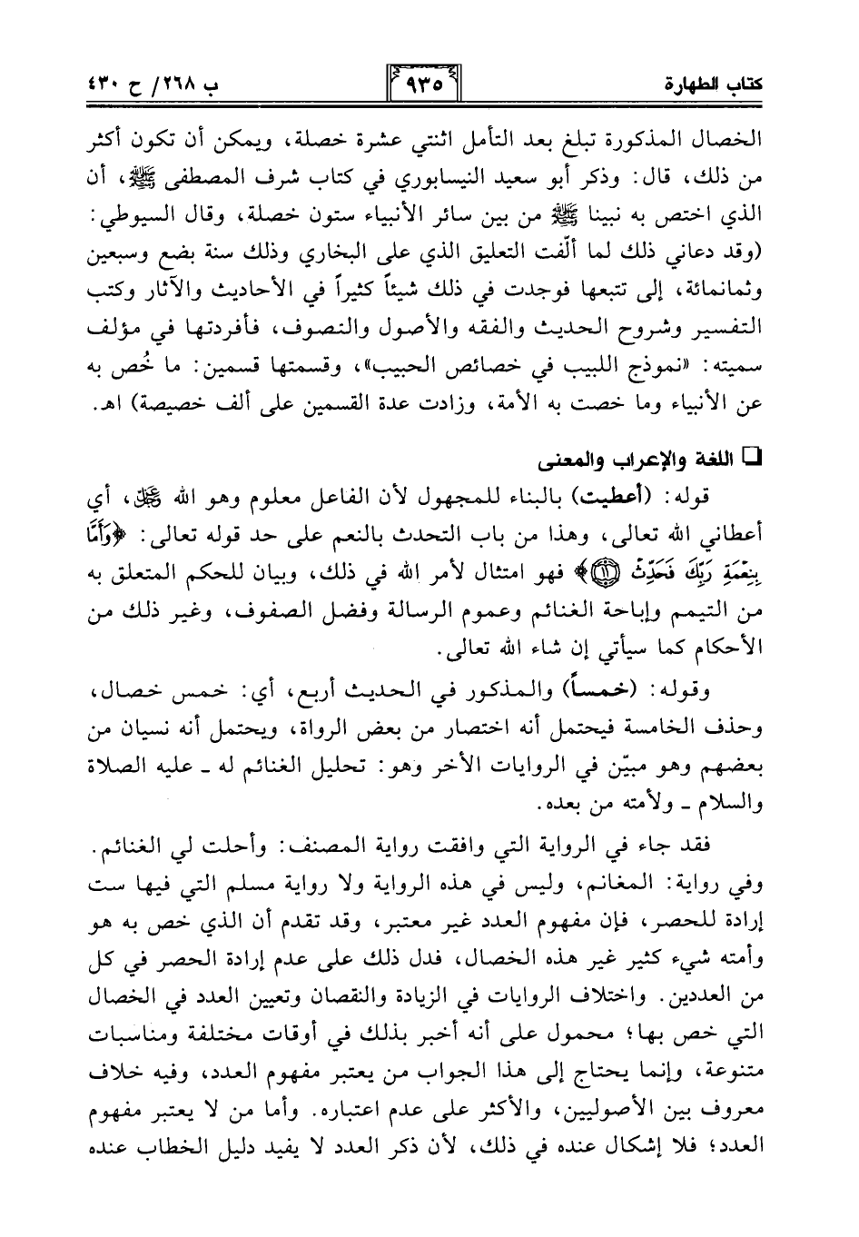 الخصال المذكورة تبلغ بعد التأمل اثنتي عشرة خصلة، ويمكن أن تكون أكثر من ذلك، قال: وذكر أبو سعيد النيسابوري في كتاب شرف المصطفى - صلى الله عليه وسلم -، أن الذي اختص به نبينا - صلى الله عليه وسلم - من بين سائر الأنبياء ستون خصلة، وقال السيوطي: (وقد دعاني ذلك لما ألّفت التعليق الذي على البخاري وذلك سنة بضع وسبعين وثمانمائة، إلى تتبعها فوجدت في ذلك شيئًا كثيرًا في الأحاديث والآثار وكتب التفسير وشروح الحديث والفقه والأصول والتصوف، فأفردتها في مؤلف سميته: "نموذج اللبيب في خصائص الحبيب"، وقسمتها قسمين: ما خُص به عن الأنبياء وما خصت به الأمة، وزادت عدة القسمين على ألف خصيصة) اهـ.