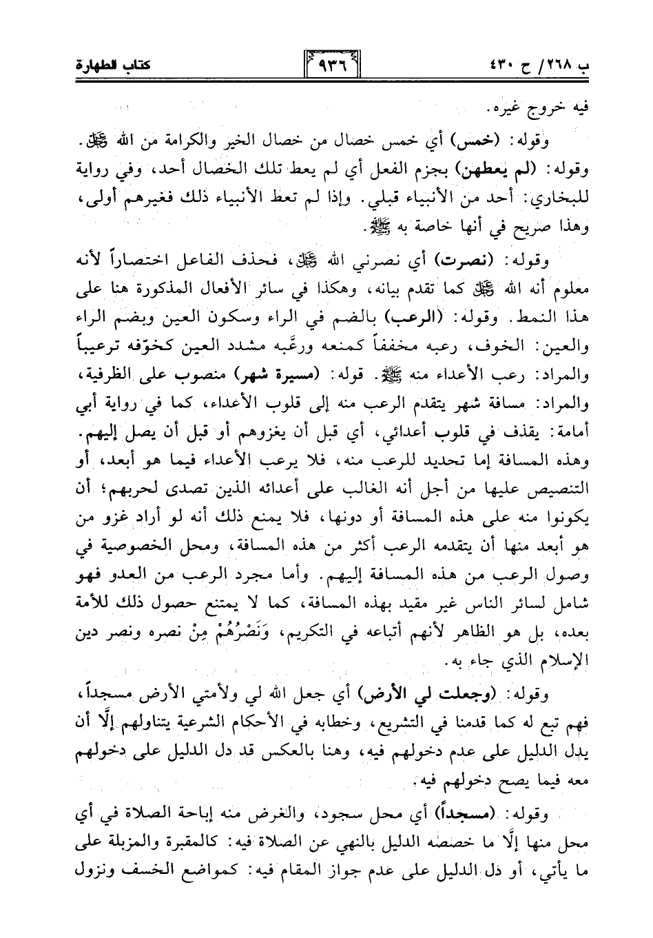 وقوله: (نصرت) أي نصرني الله -عز وجل-، فحذف الفاعل اختصارًا لأنه معلوم أنه الله -عز وجل- كما تقدم بيانه، وهكذا في سائر الأفعال المذكورة هنا على هذا النمط. وقوله: (الرعب) بالضم في الراء وسكون العين وبضم الراء والعين: الخوف، رعبه مخففًا كمنعه ورعبه مشدد العين كخوّفه ترعيبًا والمراد: رعب الأعداء منه - صلى الله عليه وسلم -. قوله: (مسيرة شهر) منصوب على الظرفية، والمراد: مسافة شهر يتقدم الرعب منه إلى قلوب الأعداء، كما في رواية أبي أمامة: يقذف في قلوب أعدائي، أي قبل أن يغزوهم أو قبل أن يصل إليهم. وهذه المسافة إما تحديد للرعب منه، فلا يرعب الأعداء فيما هو أبعد، أو التنصيص عليها من أجل أنه الغالب على أعدائه الذين تصدى لحربهم؛ أن يكونوا منه على هذه المسافة أو دونها، فلا يمنع ذلك أنه لو أراد غزو من هو أبعد منها أن يتقدمه الرعب أكثر من هذه المسافة، ومحل الخصوصية في وصول الرعب من هذه المسافة إليهم. وأما مجرد الرعب من العدو فهو شامل لسائر الناس غير مقيد بهذه المسافة، كما لا يمتنع حصول ذلك للأمة بعده، بل هو الظاهر لأنهم أتباعه في التكريم، وَنَصْرُهُمْ مِنْ نصره ونصر دين الإِسلام الذي جاء به.